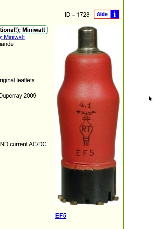 - Merci Gilles et Jean-Claude pour la suggestion EF5 ou EF9. La base de ma lampe inconnue est entourée d’une dizaine de spires de fil de cuivre. Or, d’après les photos visibles sur la base de données, la EF5 n’en a pas (https://www.doctsf.com/lampe-ef5/l111) alors que la EF9 en a (EF9 - doctsf.com, base documentaire lampes (tubes)). Cela suffit-il à les distinguer l’une de l’autre ? Sinon, quel autre moyen pourrais-je avoir (sauf erreur de ma part sur la lecture des schémas de brochage, elles ont le même brochage) ? Sont-elles équivalentes ? Prends-je un risque à remplacer l’une par l’autre ?