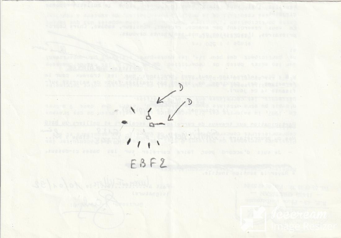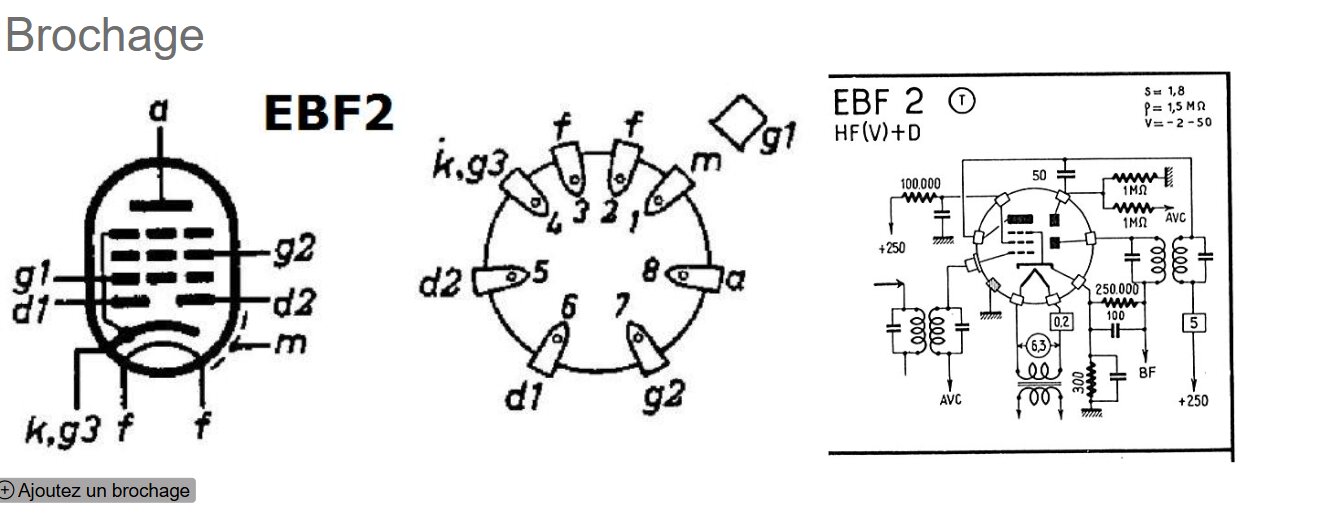 EBF2 : 3,5 V sur broche 4 (k, g3, connectée par une R 5800 Ohms à la masse), 2,8 V sur broche 5 (d2, connectée directement à un transfo MF), 0,22 V sur broche 6 (d1, connectée par une R 1 MOhm à la masse), 50 V sur broche 7 (g2, connectée par une R 1,5 MOhm à la HT), 102 V sur broche 8 (a, connectée par une R 250 KOhms, mais mesurée à 400 KOhms , à la HT), 0 V sur téton (g1, connecté directement à la masse).