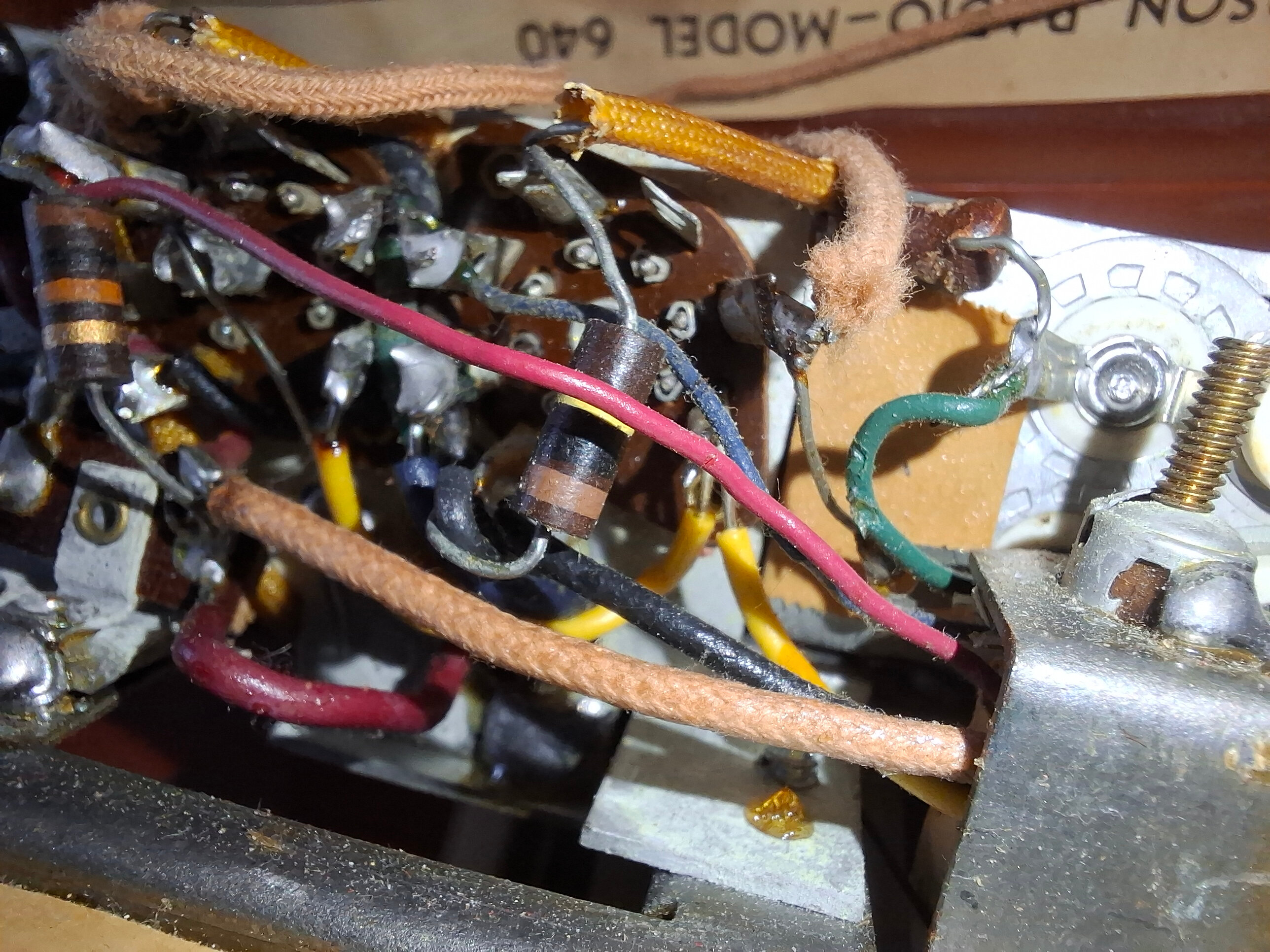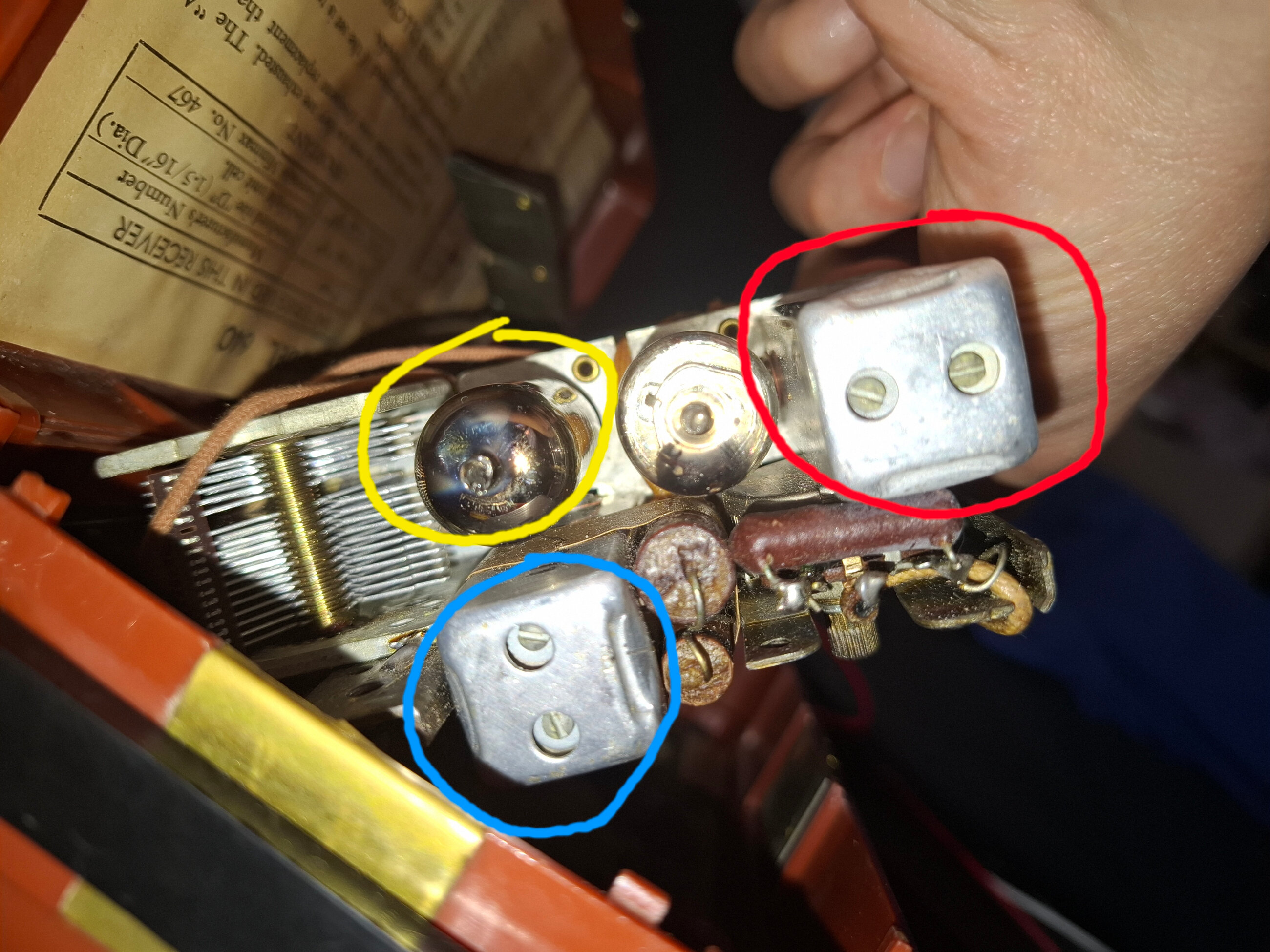 Voici l’arrière de 1R5. Le fil jaune correspond à l’alimentation du filament, normalement broche 7 sur le schéma. Sur la broche d’à côté, on ne devrait pas trouver le fil d’antenne. Pourtant c’est ce que j’ai en pratique