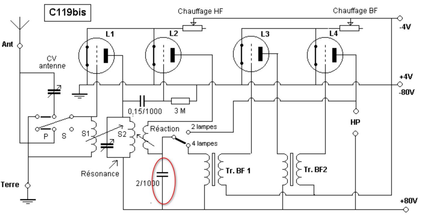 C’est le principe du C-119 bis, la bobine du circuit d’accord antenne est montée en couplage variable avec la bobine du circuit de résonance, ce qui permet une sorte de neutrodynage de l’étage amplificateur HF.