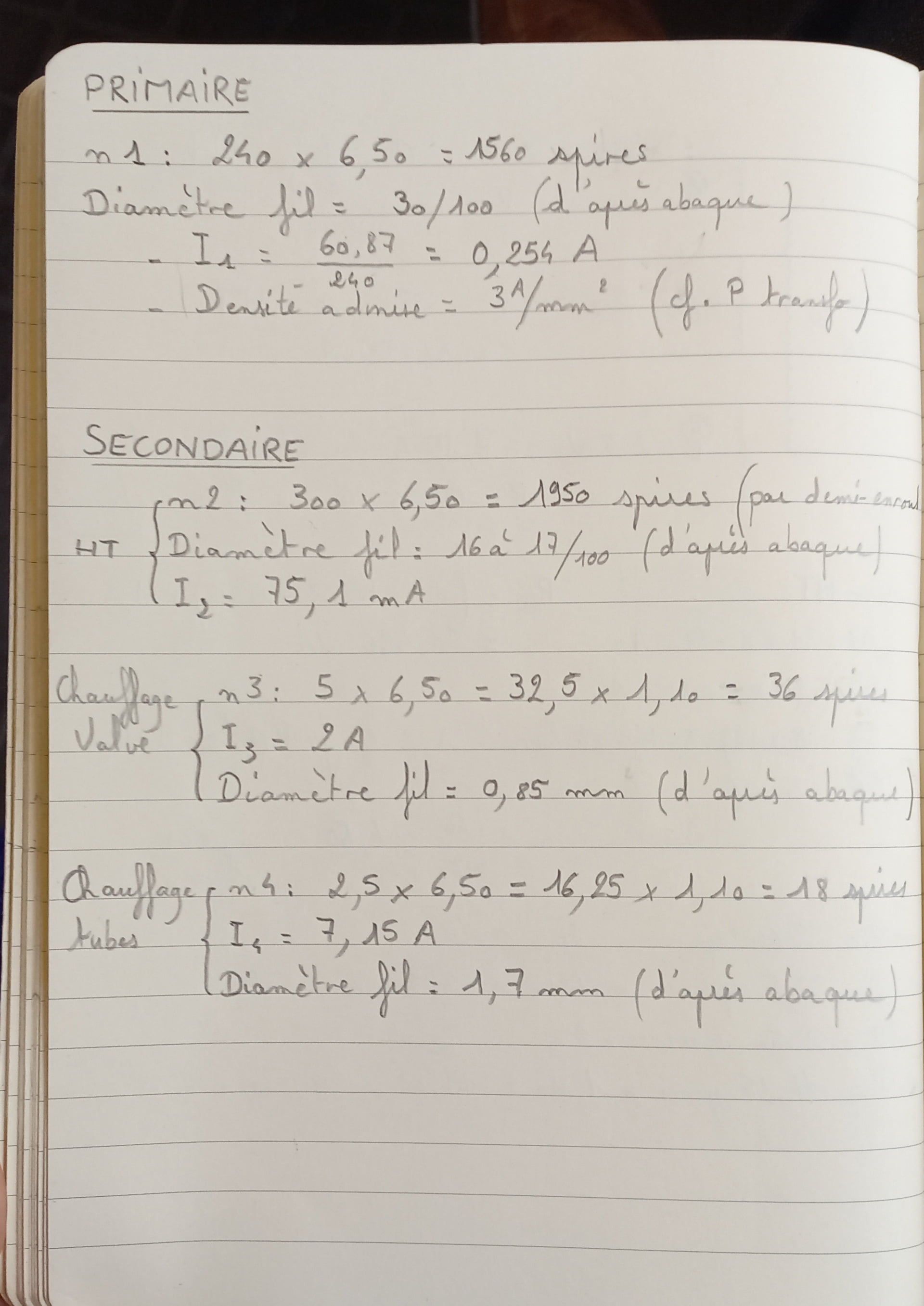 J’ai calculé les caractéristiques du transfo, notamment le nombre de spires de chaque enroulement (modification tension du primaire) en prenant 6,5 spires/volt, et le diamètre des fils
