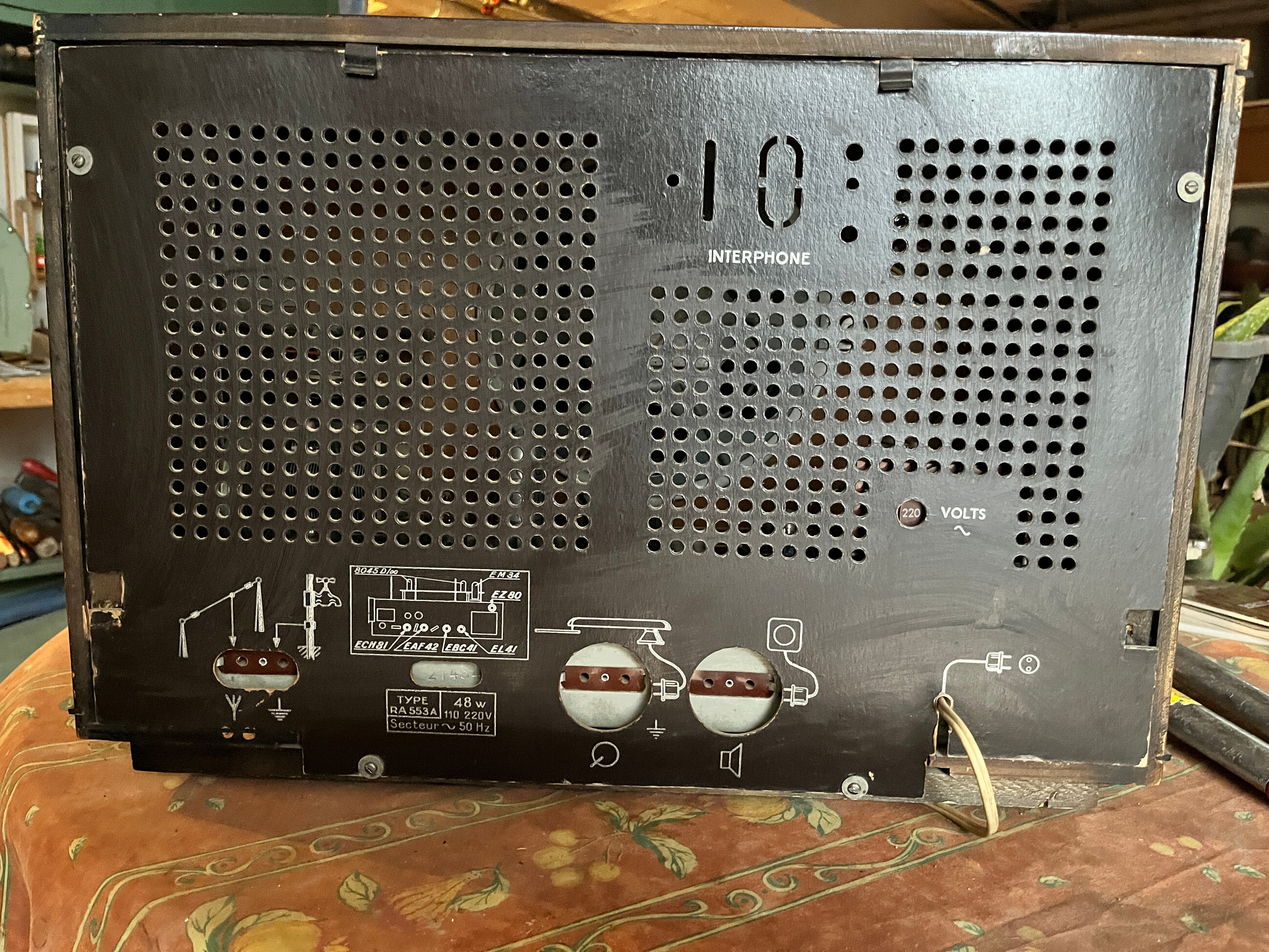 Dans ces modèles Philips et Radiola on peut remarquer sur le carton arrière l’emplacement réservé à un module optionnel « Interphone ».