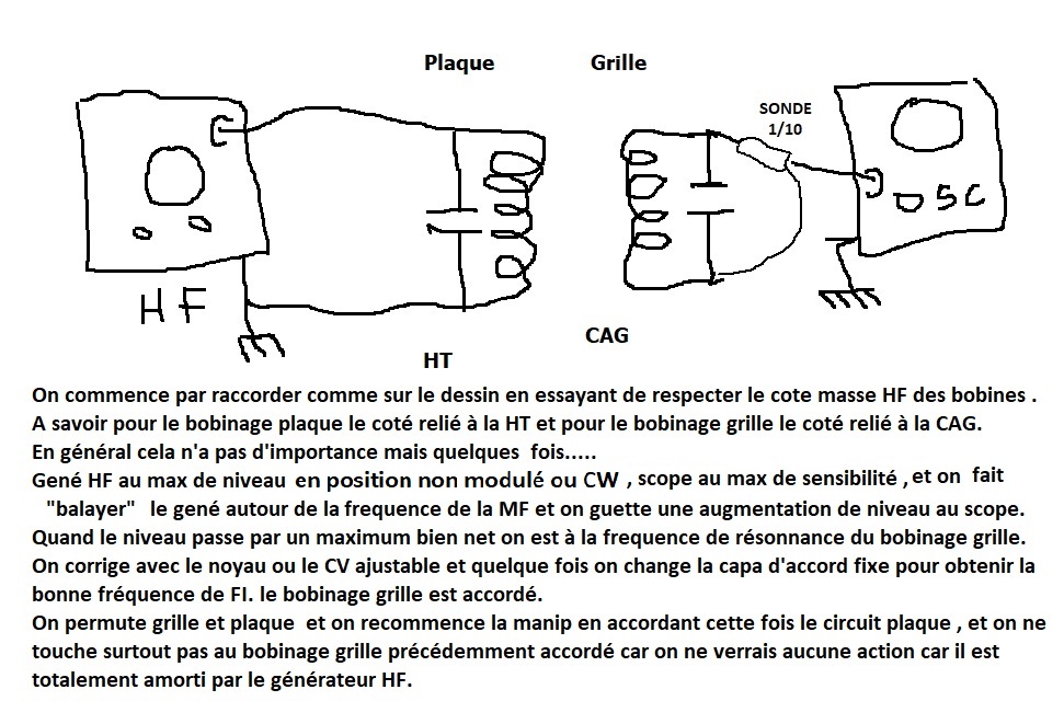 Il y a quelques années,j’ai remis en état un Super Groom 41, et, bien sûr, j’ai eu droit aux noyaux collés !Javais sous la main, d’autres transfos qui pouvaient être montés en lieu et place,mais l’accès aux réglages,était latéral,et, vu la place restante, il était impossible de les utiliser. Je me suis fait suer, mais j’ai réussi à faire mes réglages.Première opération, démontage des transfos,remplacement des condensateurs, par d’autre de valeur plus basses( autant que je m’en souvienne,50 a 75 Pf de moins). Remontage,recâblage, et réglage, en utilisant un petit CV d’une centaine de Pf (mesure de la valeur), mise en place d’un condensateur le plus proche possible de la valeur mesurée,et, comme ça ,un par un, j’ai approché la fréquence désirée. j’ai terminé avec une ou deux petites torsades de fil émaillé, mai, c’était un peu du pinaillage. j’y ais tout de même passé, je crois, un dimanche après-midi complet,voir, jusqu’au repas du soir! mais, ça a payé !!
