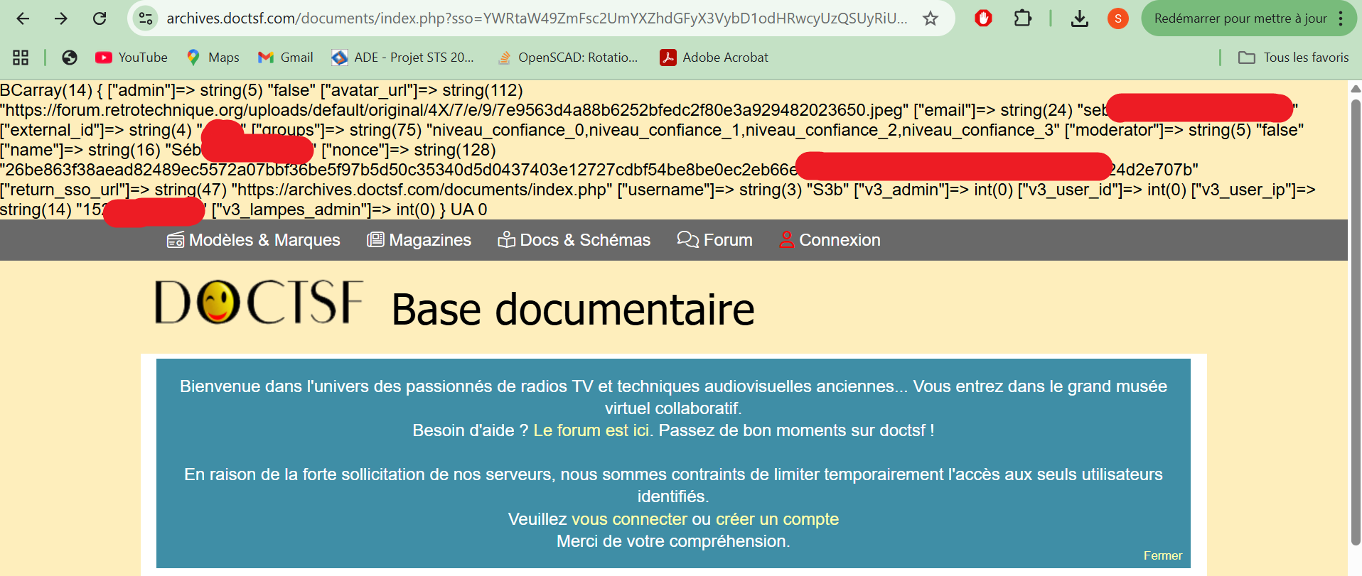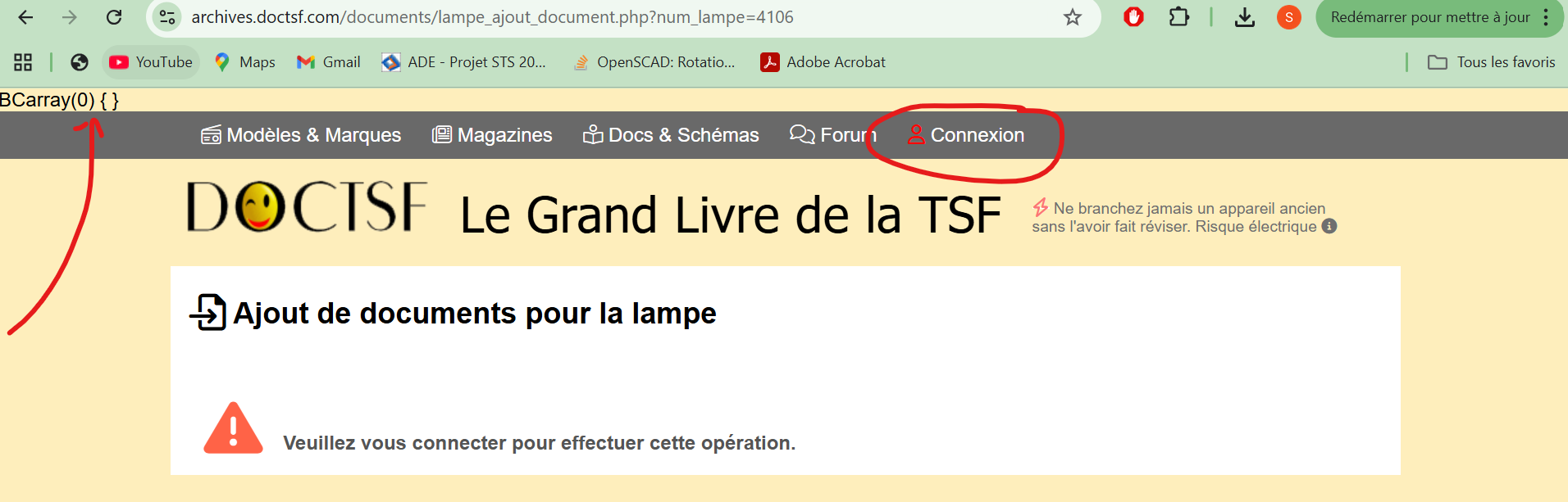 Je suis parfaitement connecté sur doctsf et lorsque je souhaite ajouter un PDF (dans la section « Documents relatifs à … »), pour la lampe « RS291 », j’ai un message qui me dit que je ne suis pas connecté :