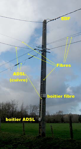 à la campagne, électricité, téléphone (fibre et ADSL ) sont distribués par des lignes aériennes soutenues par des poteaux