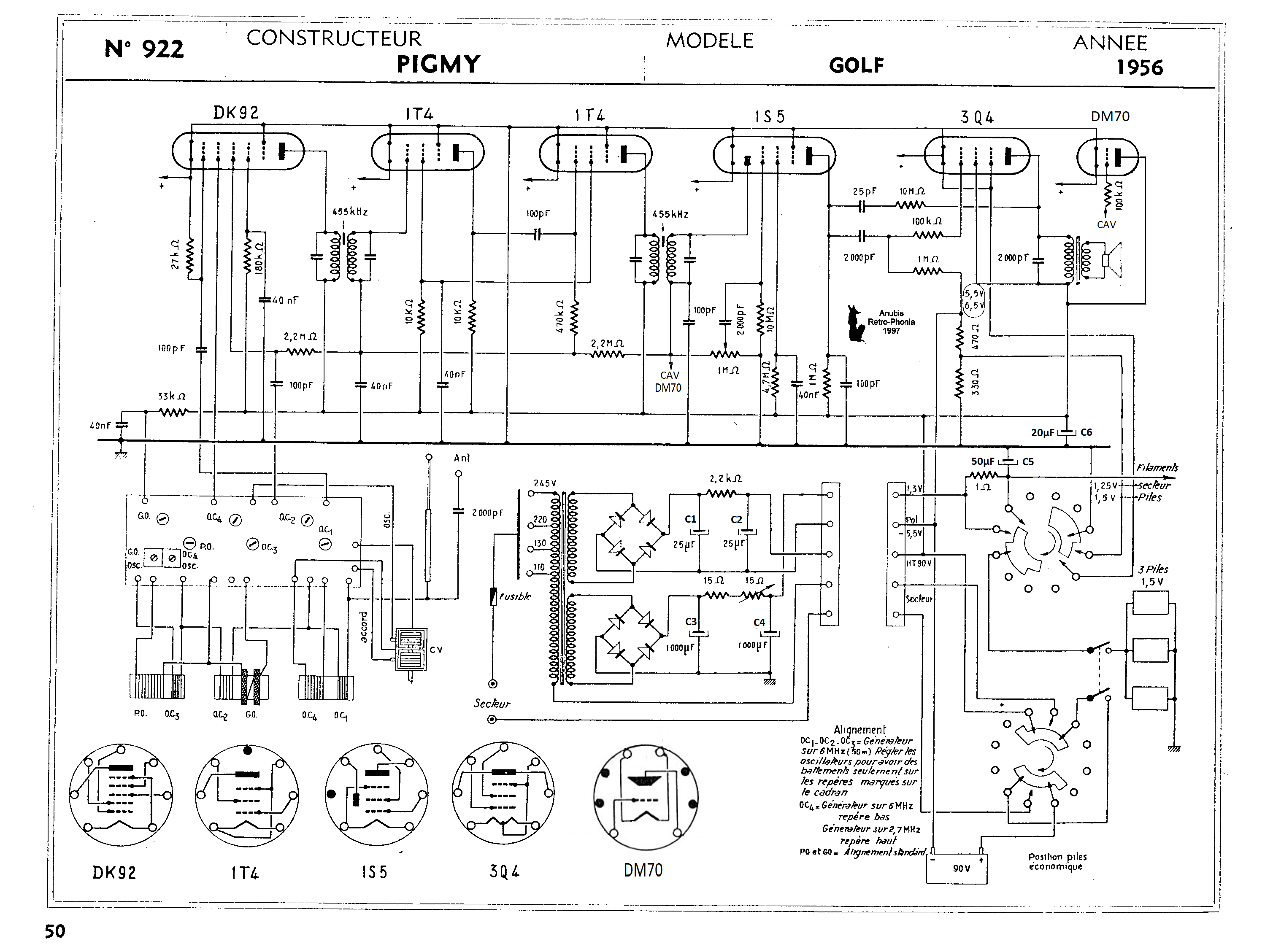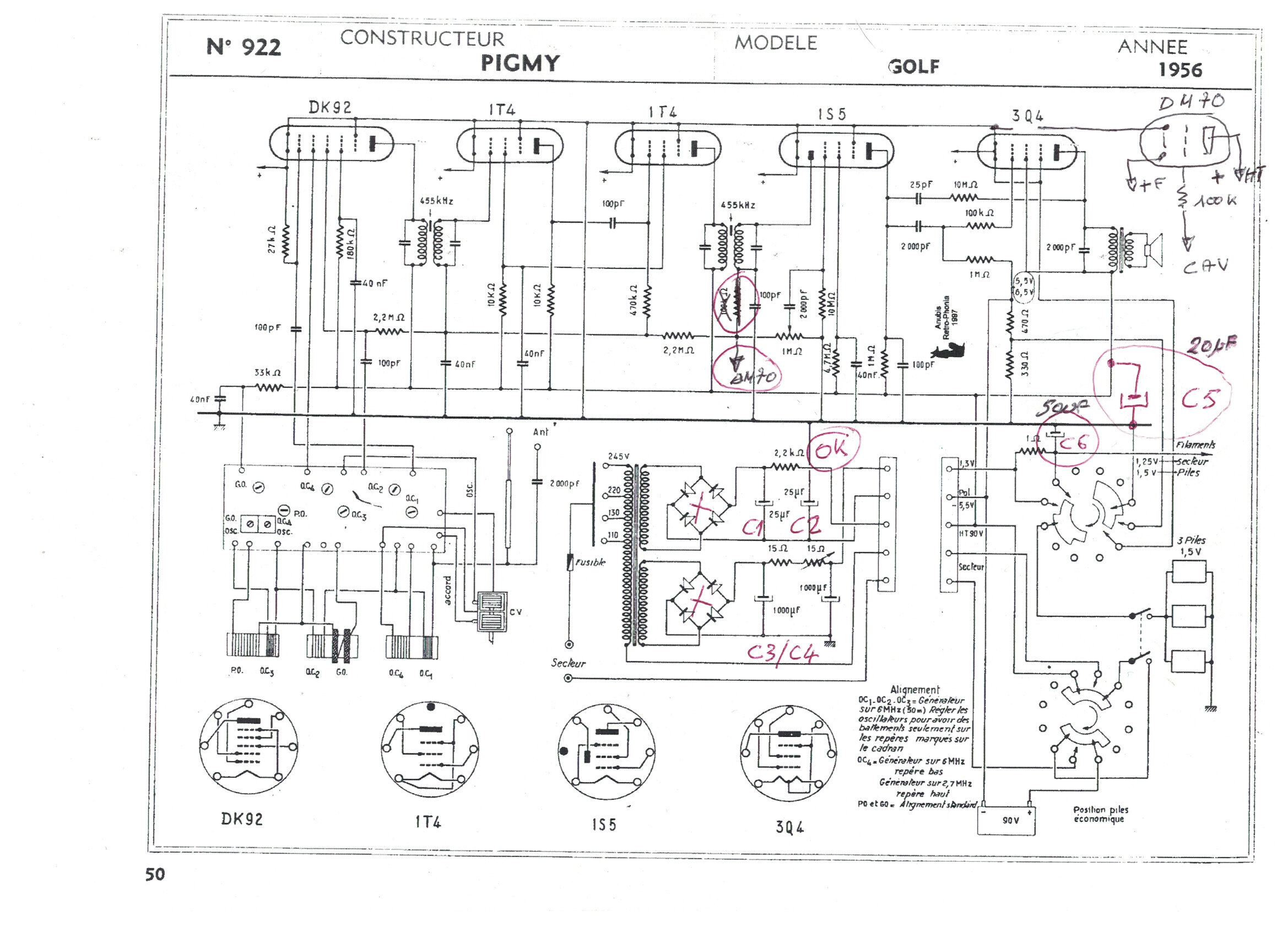 Le premier tube examiné, est une DK96, mais, juste à côté, une DF91 ! Déjà une question, se pose : Comment, les filaments, sont-ils raccordés, car les séries 96, et 91, ne sont pas faites pour « vivre ensemble » Il ya, en façade, une DM70 ou 71 (peut-être, une explication).