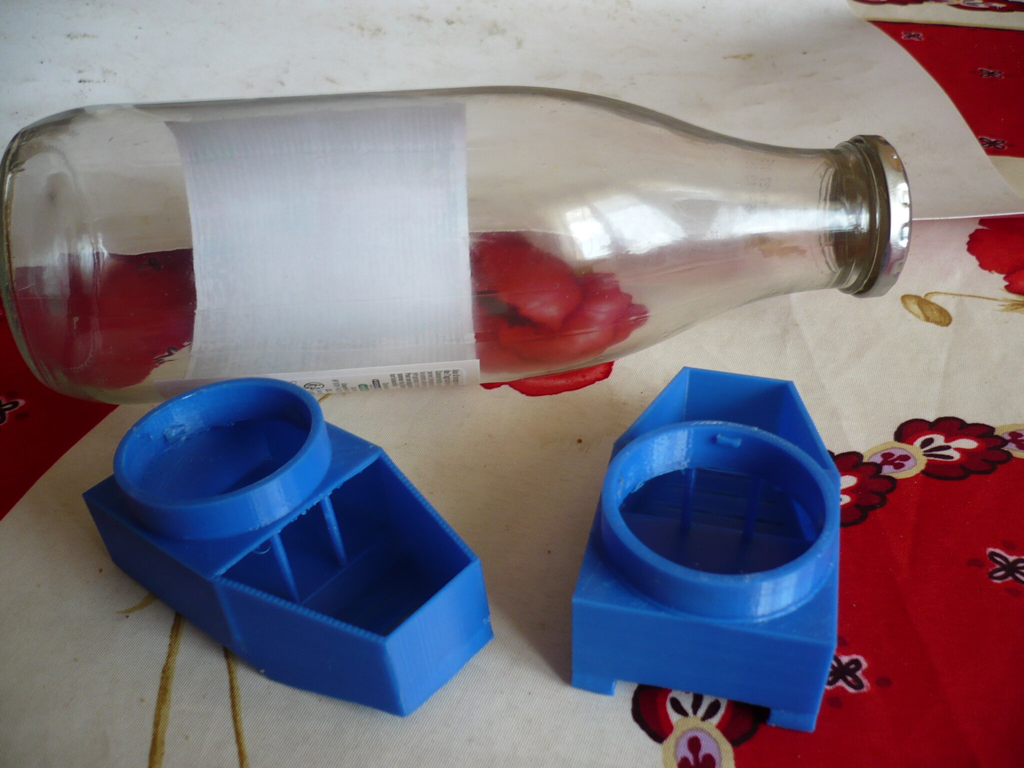 Le réceptacle est confectionné à l’imprimante 3D, vient se visser sur le goulot de 42 mm de la bouteille. Il pourra être disponible dans la base de données des fichiers 3D (si personnes intéressées)