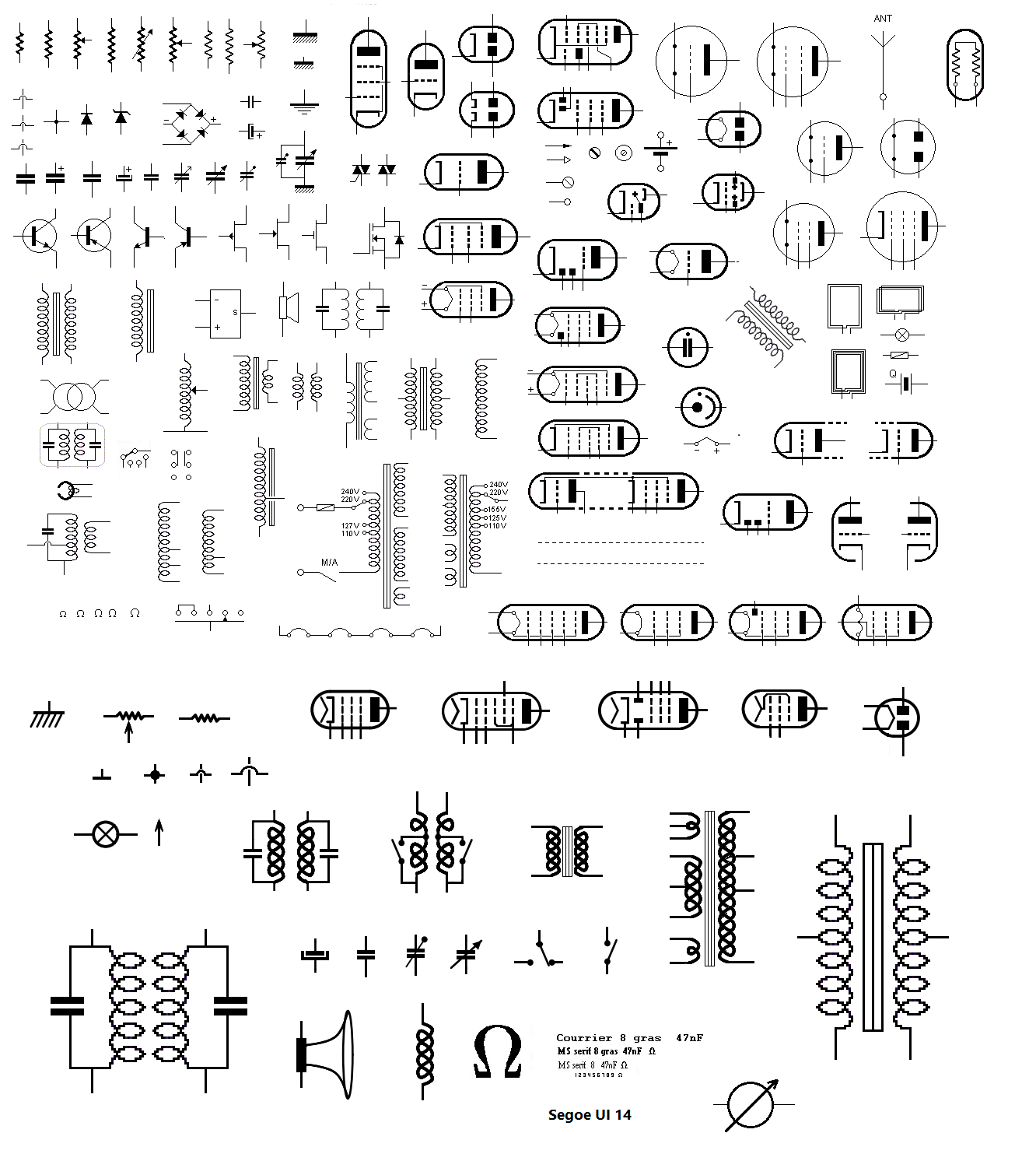 (J’ai supprimé quelques symboles , jugés superflu pour moi, ajouté quelques traits gras et traits fins, et “envelloppes” rondes ou carrés, par commodité, et quelques flèches courbes pouvant être utile pour indiquer des couplages variables entre bobine, par exemple pour les transfo MF a selectivité variables, ou pour les bobines articulés de variomètres de postes batteries des années 1920…)