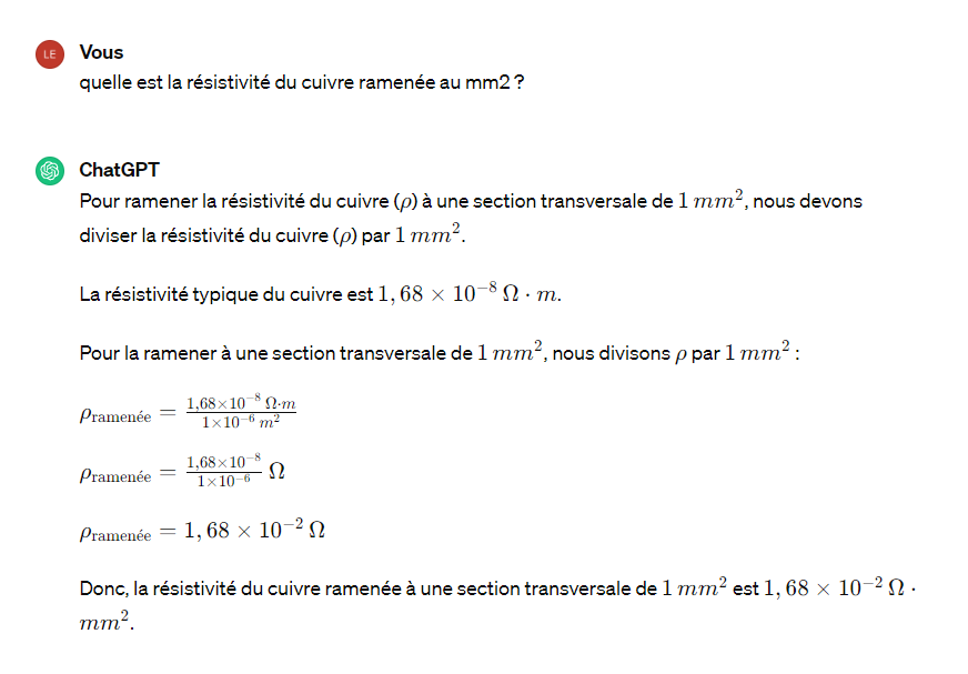 La question était du genre : quelle est la résistivité du cuivre ramenée au mm2 ?