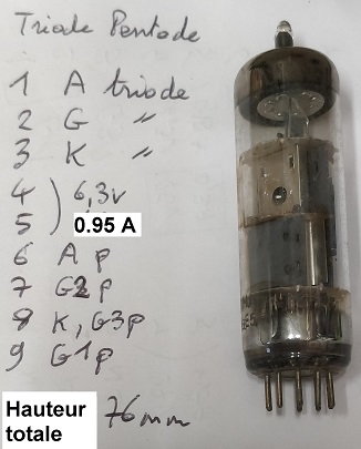 Une triode-pentode qui ressemble fortement à une ECL85 ou ECL805. Tout concorde, sauf le courant de chauffage. Je le mesure à 950mA sous 6.3V, alors qu’il est donné à 875mA dans les docs.