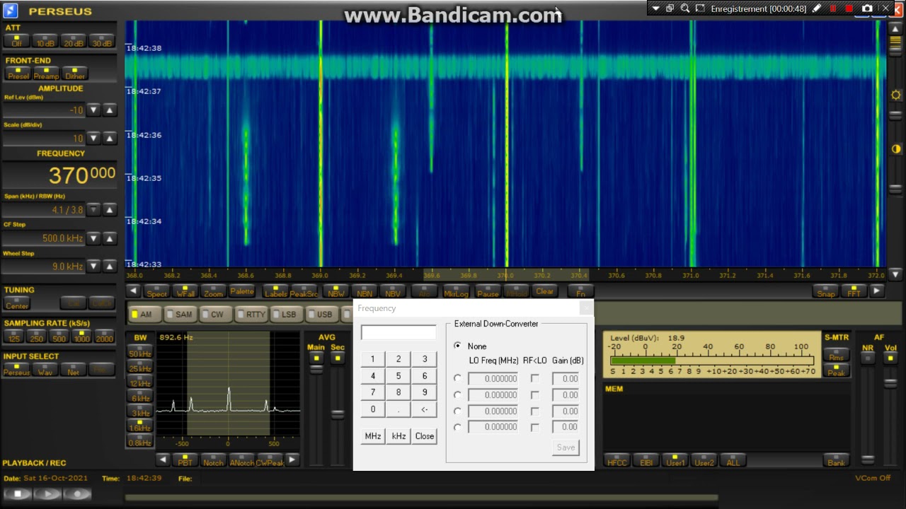On voit bien la porteuse sur 370 et la modulation sur 369,6 et 370,4