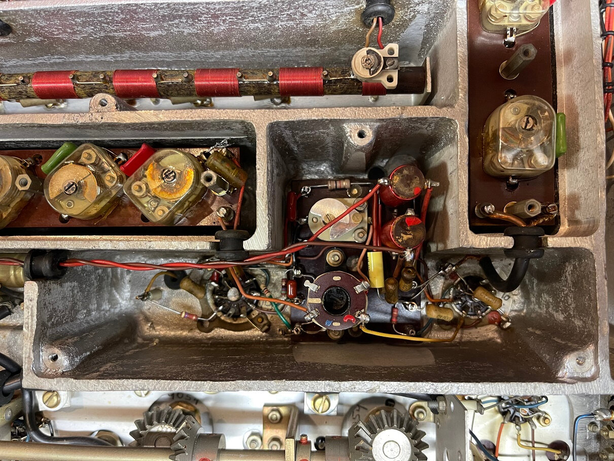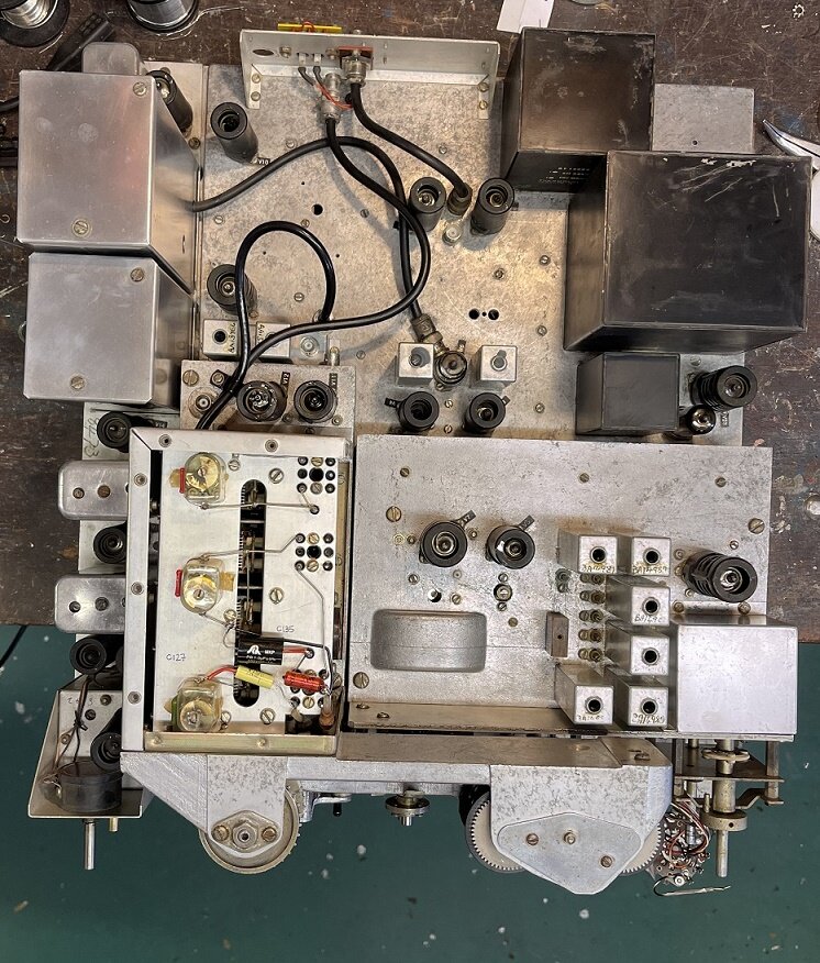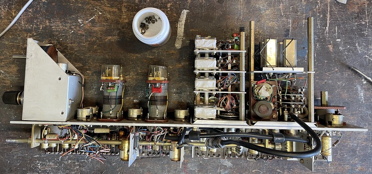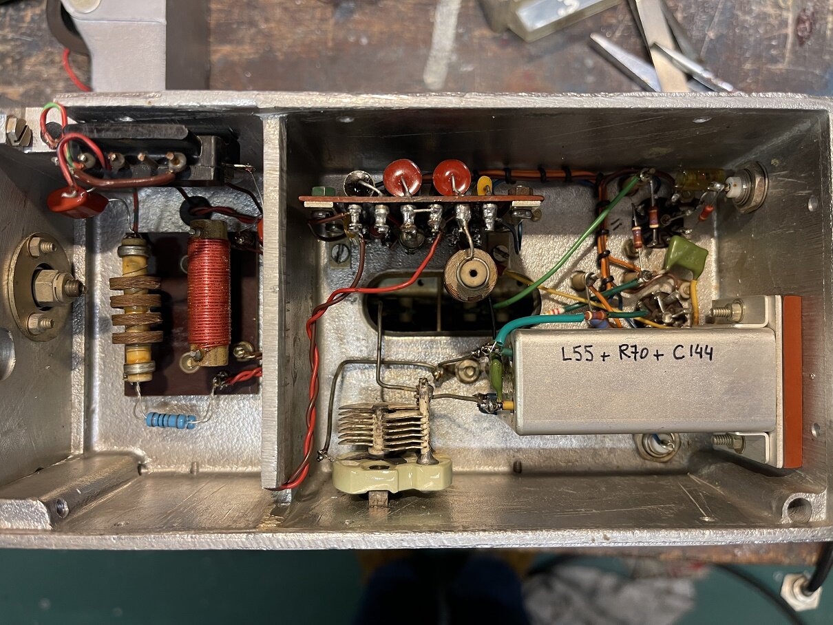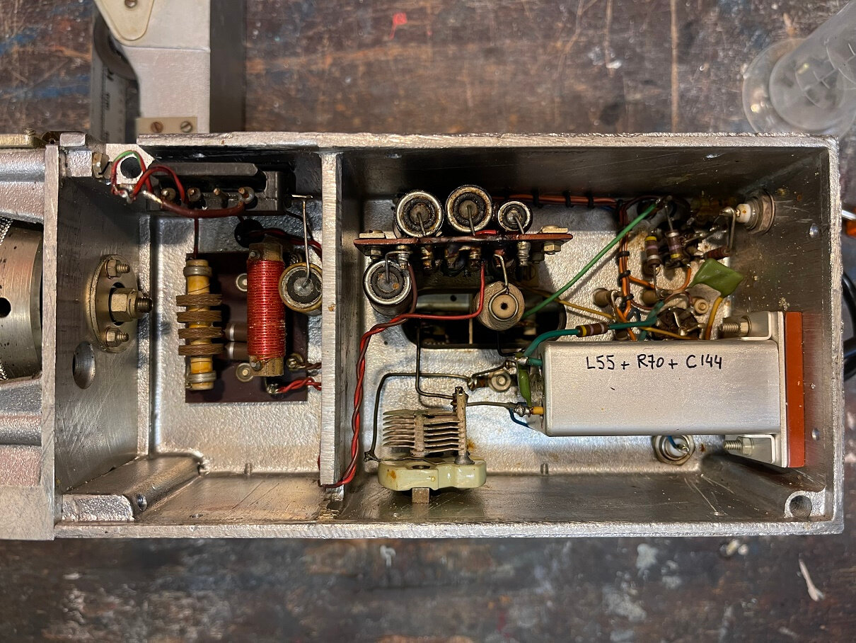 On peut voir que l’ampli BF est fini, il faut garder la ECC81 car sinon le galva en mode signal BF restera muet. C’est un des défauts observés avant la grosse révision en cours. Les 3 grosses capas d’origine de cette partie sont maintenant pas plus grosses que le bout de mon auriculaire et 4 fois plus grandes en capacité pour les cathodes…
