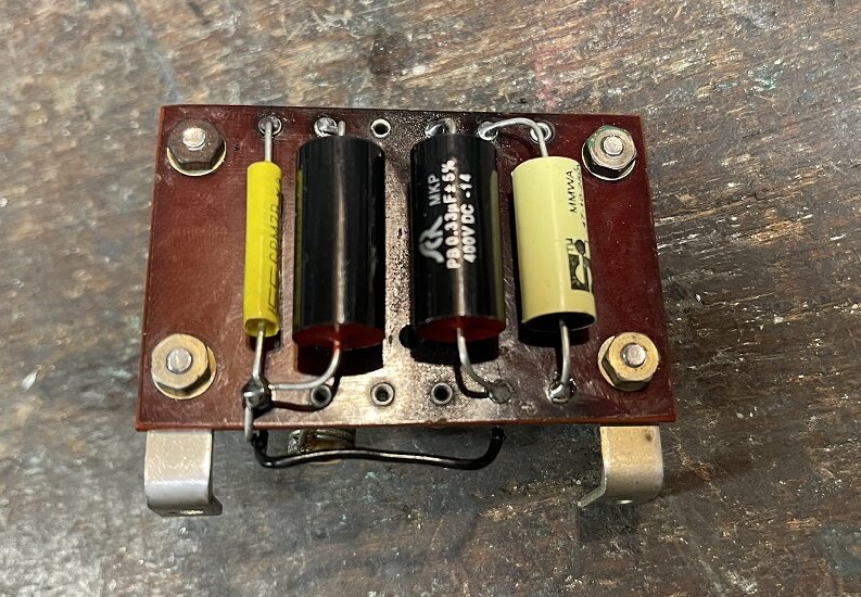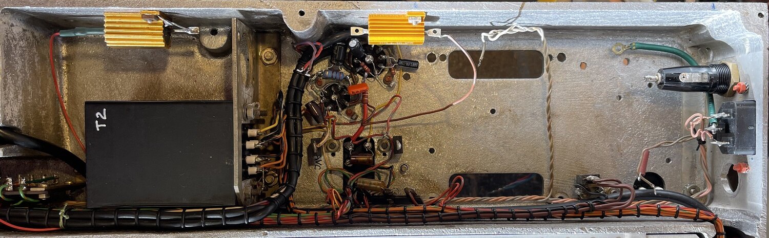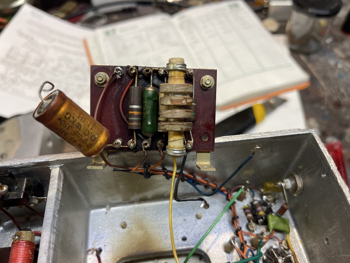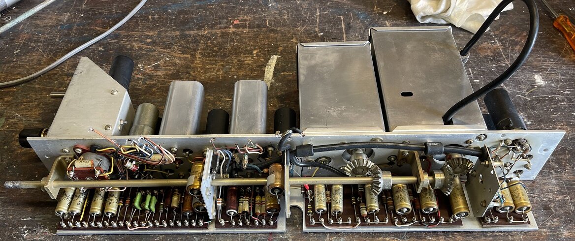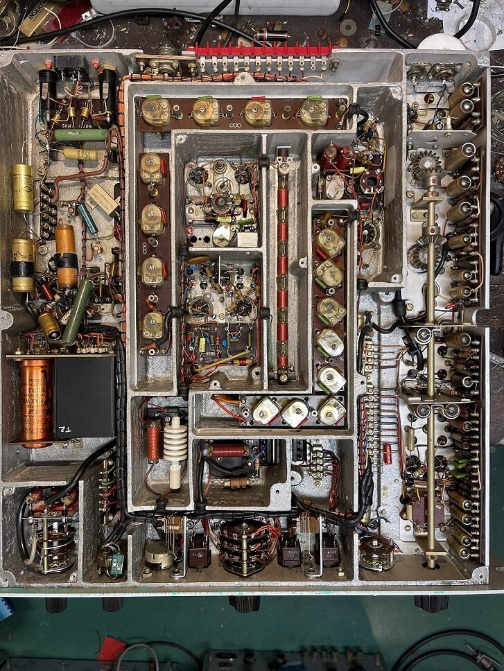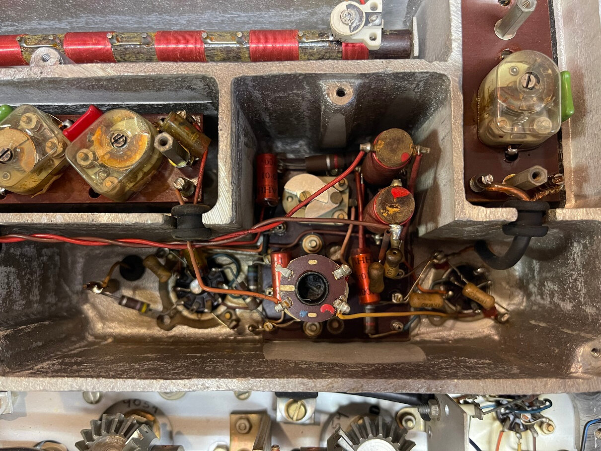 On peut voir que l’ampli BF est fini, il faut garder la ECC81 car sinon le galva en mode signal BF restera muet. C’est un des défauts observés avant la grosse révision en cours. Les 3 grosses capas d’origine de cette partie sont maintenant pas plus grosses que le bout de mon auriculaire et 4 fois plus grandes en capacité pour les cathodes…