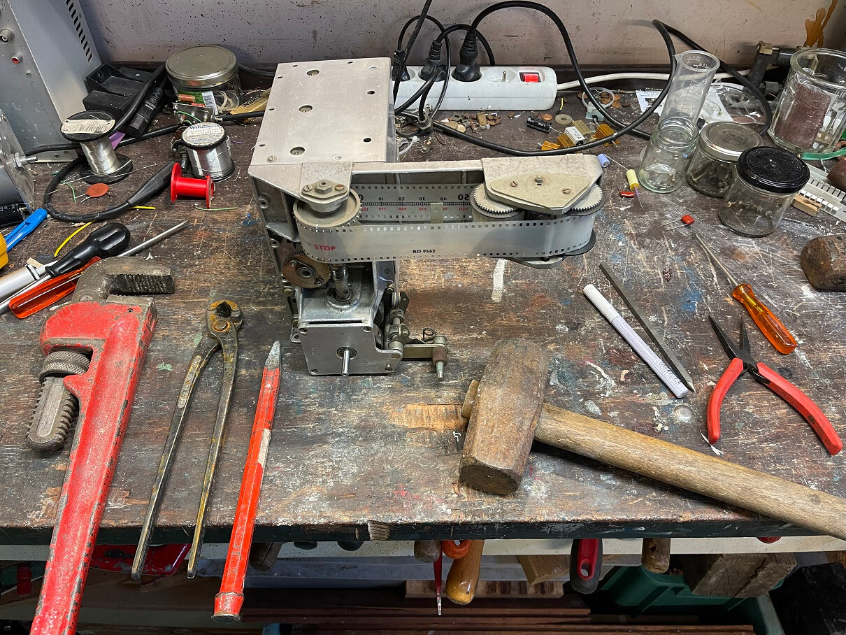 Mécanisme de tension du film, j’espère que je ne vais pas regretter de démonter tout ça, mais il faut sortir le film pour le grand nettoyage. Le film est installé et les ressorts se tendent en insérant l’engrenage céloron (pour le remontage)