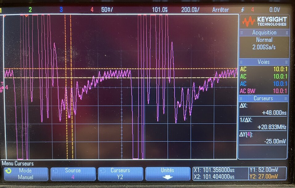 En mode zoom, elles apparaissent. Je reste un peu sur ma faim car on parle de 20-50 mV pour attaquer la mélangeuse suivante quand le signal de l’OL qui les attaque font quelques volts dans mes habitudes. Si quelqu’un a quelques explications bienvenues, je prends. C’est pour ça que j’ai révisé la plage haute du 1MHz. Je suis surpris même si ça marche. Il y a un réglage sur une capa quasiment sans influence en amont du filtre (C7). En testant avec un trimmer de gamme plus large, on change les amplitudes d’autres harmoniques (pas de photo), mais sans alignement complet et les FI pas restaurées, pas d’amélioration notable observée en réception. Donc j’ai fait machine arrière en ressoudant le C7 d’origine.