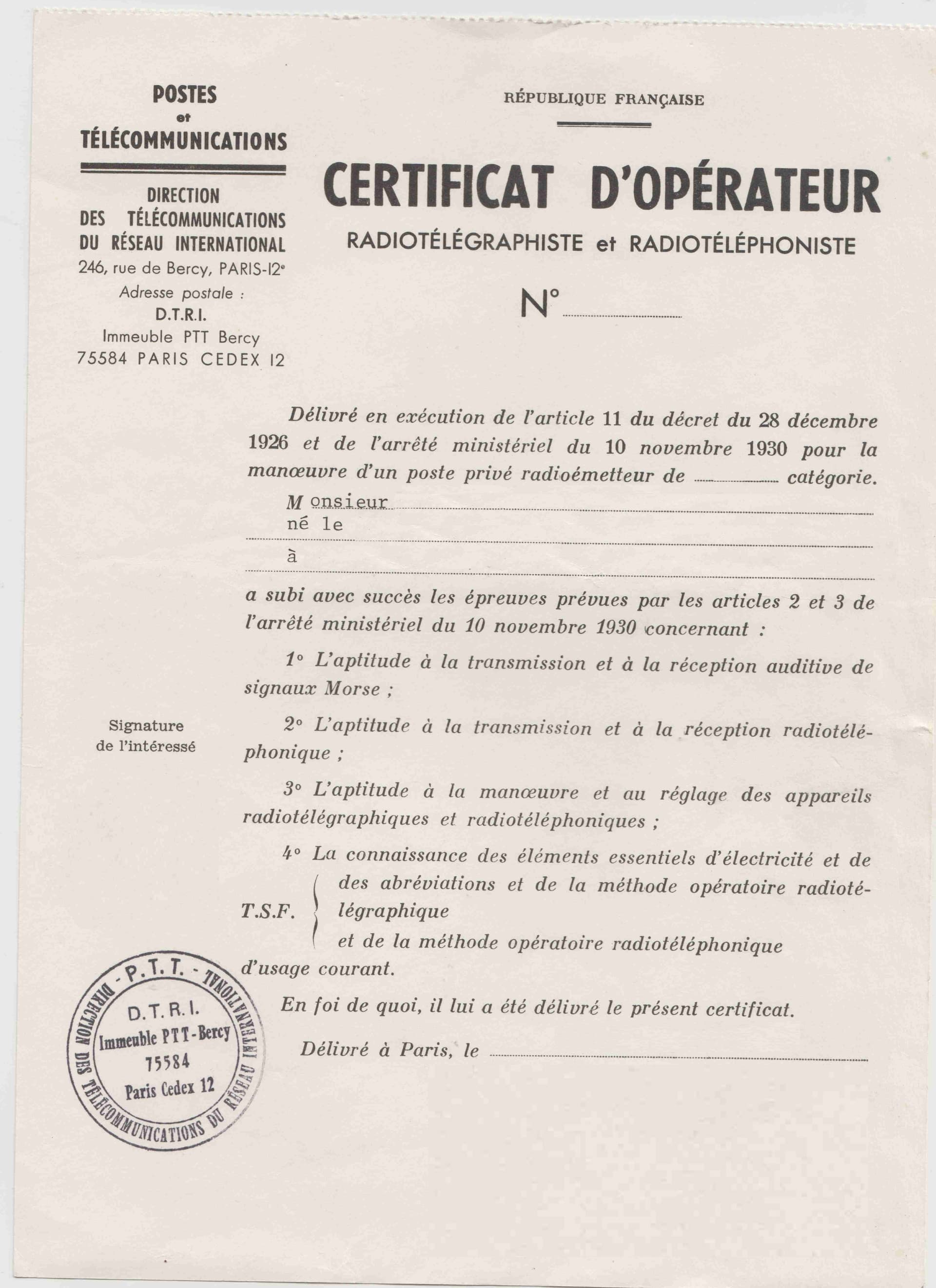Voici le certificat d’opérateur qu’on recevait aprés la réussite à l’examen dans les années 70.