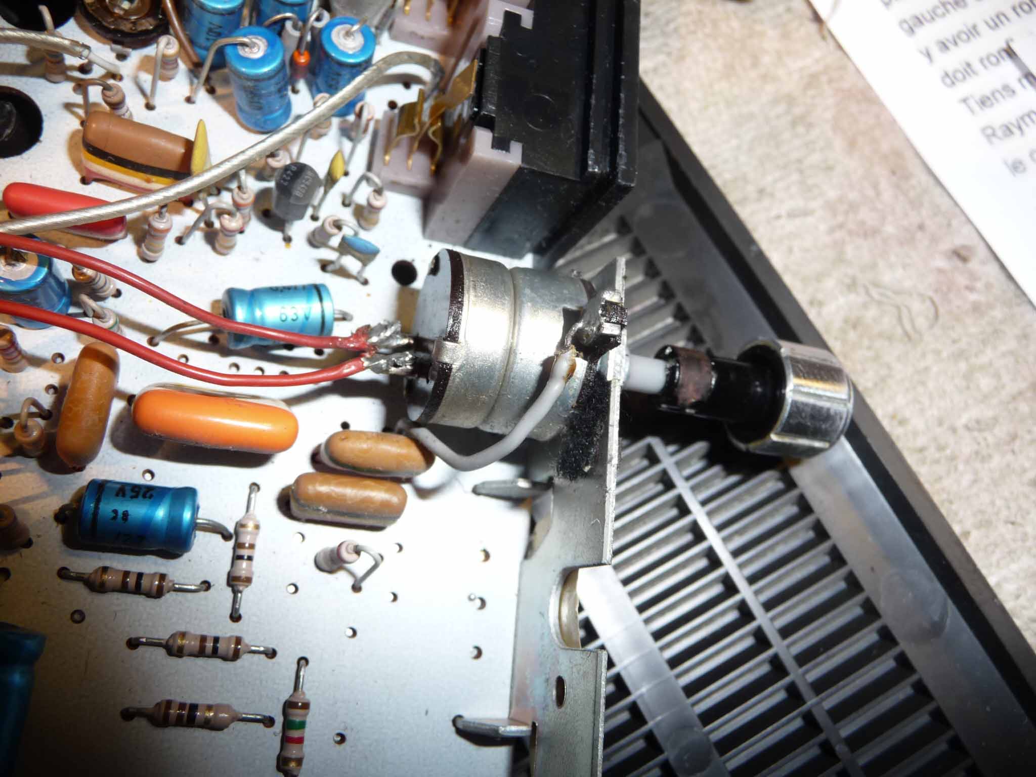Voilà Raymond, pour ce qui est de la BF tu touches avec un tournevis métallique le milieu du pot volume, mais qu’entends tu par milieu du pot ? il n’y à que 2 fils rouges et un gris sur le bord, je les ai touché tous les trois et rien ne se passe ( photo )