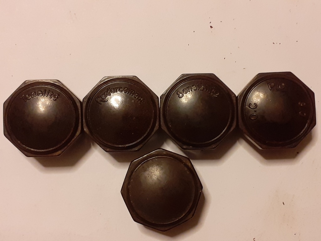 Je remonte gentiment le poste dans sa caisse en essayant de respecter au mieux les pièces d’origine. J’en suis aux boutons. J’avais dû percer leur vis de blocage pour les extraire en pensant remplacer leur cerclage métallique avec d’autres boutons de récupération sans relief, car mes boutons possèdent un marquage :