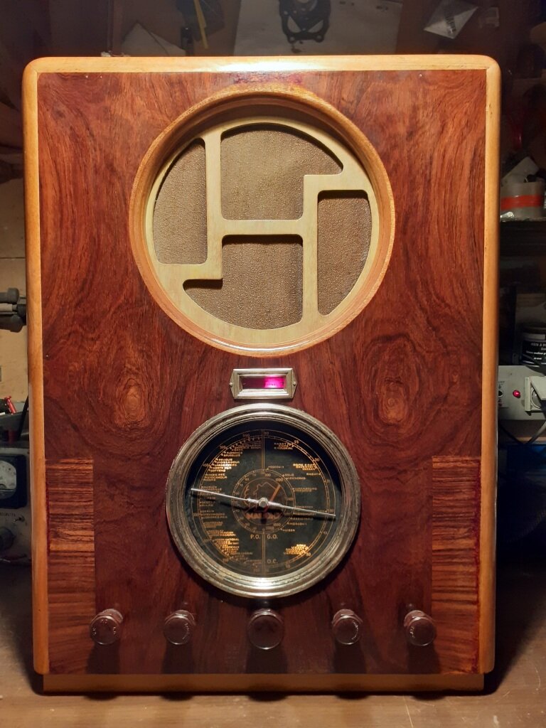 Reste à faire à ce poste, une aiguille car celle existante est réduite à pas grand-chose, trouver une vis à bois minuscule pour le clinquant de l’indicateur à ombre (je l’ai perdue, si petite) et le verre du cadran, que je peux installer après. Ce poste présente bien mieux qu’à son acquisition, et surtout possède une bonne sensibilité avec son pré-ampli HF.
