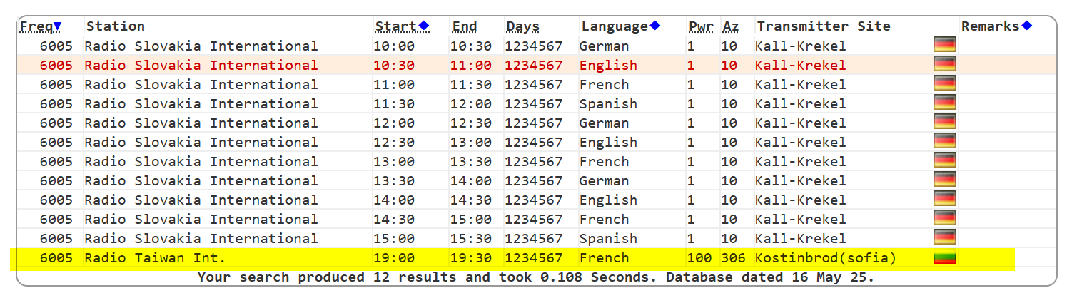 A savoir que selon l’avis des auditeurs, et la qualité de réception du signal, des émissions régulières seront diffusées au mois d’aôut 2025 certains jours de la semaine sur l’une de ces fréquences. Envoyer vos résultats par e-mail fren@rti.org.tw Et si vous avez un poste à lampe relié à une bonne antenne !