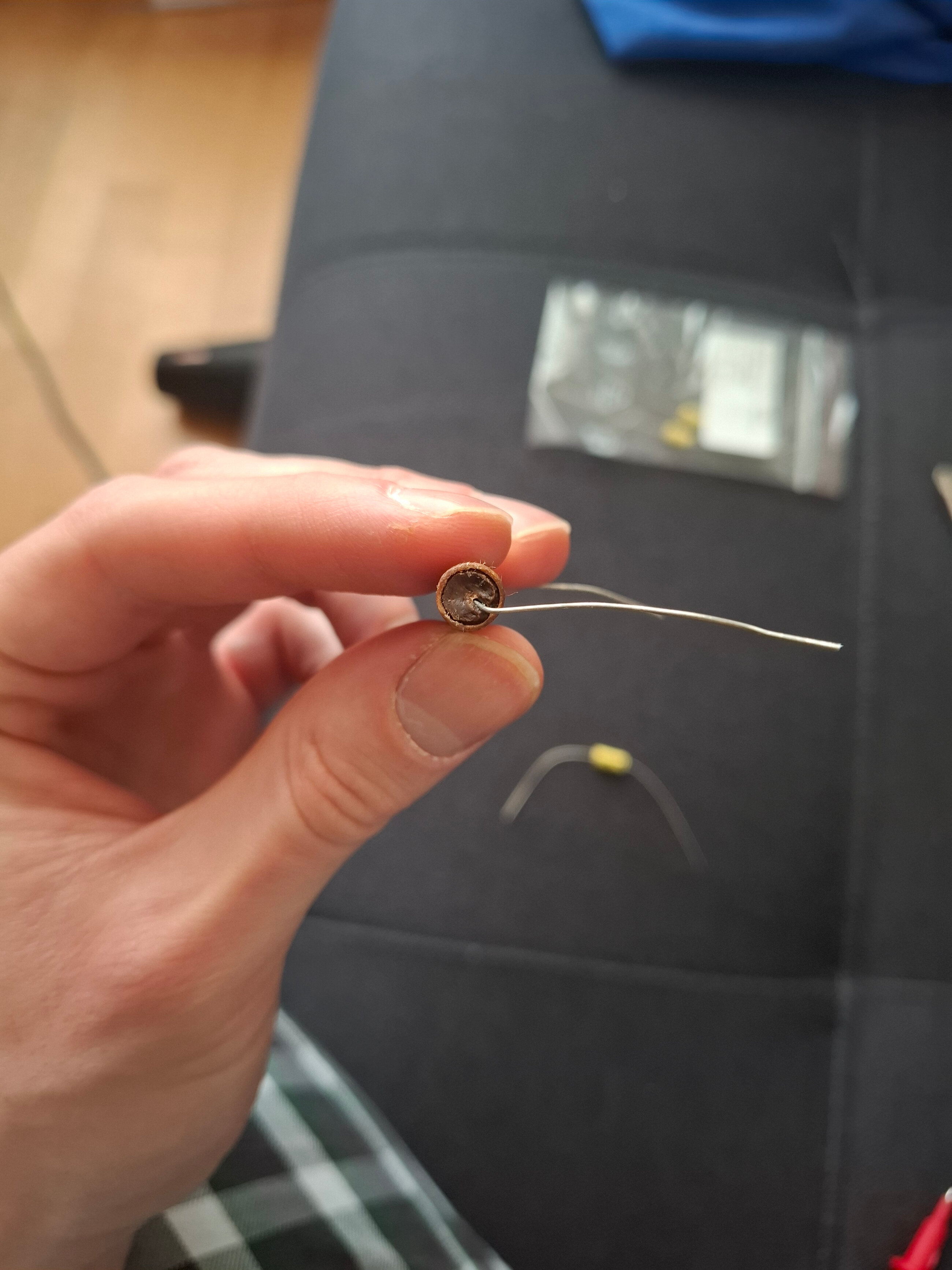 Le mastic qui se peint est une très bonne idée. Ce sont des mastics acryliques (pas ceux pour salle de bain). La marque SIKA fait ces mastics qui en plus font colle ce qui immobilisera très bien le nouveau condensateur à l’intérieur. Pas contre je n’en connais pas la résistance à la chaleur lors de la soudure des pattes ?
