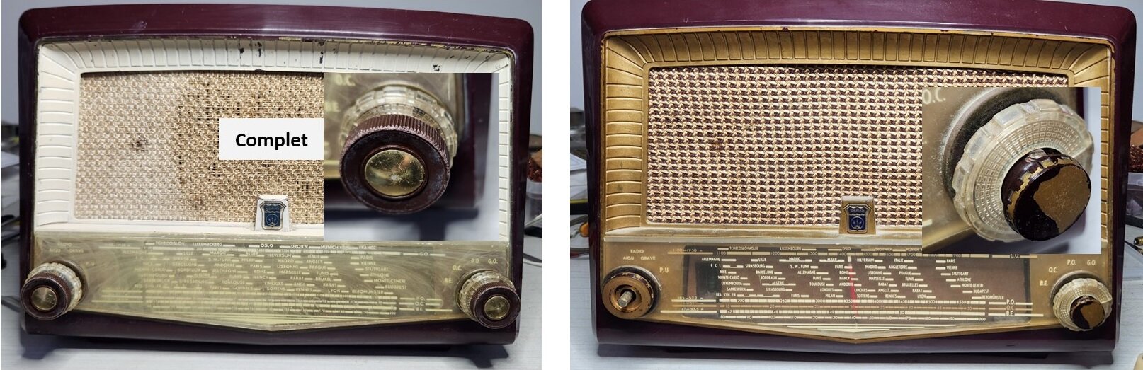 Comme tu le soulignes j’ai deux châssis en finitions légèrement différentes, les deux caisses sont en bakélite bordeaux mais un à l’entourage autour de la toile de hp crème et l’autre est « doré à l’or fin »