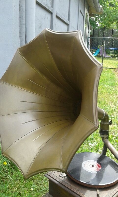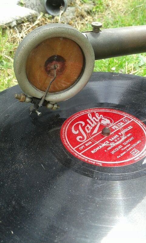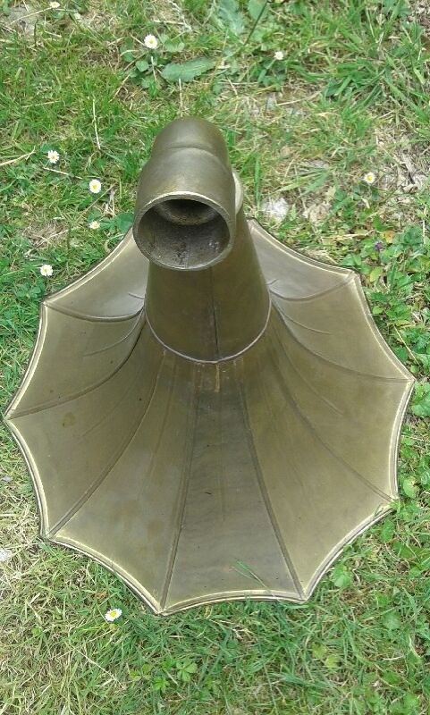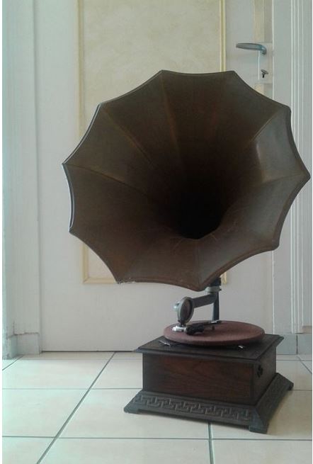 J’ai lu il y a un certain temps, mais je n’ai jamais essayé de vérifier les informations, que les phonos à pavillons avaient le plus souvent des pavillons peints, et que dès lors qu’on avait face à soi un phono avec un pavillon laiton il y avait de grandes chances que ce soit une construction récente, d’Inde, Pakistan ou d’ailleurs, sur base d’un phono valise « ré-empaqueté » pour la circonstance dans une configuration plus à même de satisfaire les goûts des acheteurs que le respect de l’origine de l’appareil, dans tous les sens du terme, et son histoire.