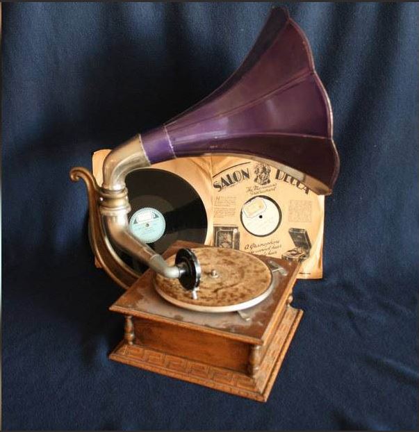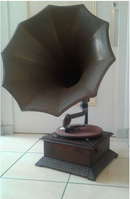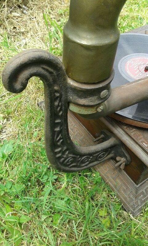 J’ai trouvé sur un site d’enchère au Luxembourg la photo d’un gramophone « Columbia ». Il a été vendu à tout petit prix, mais en comparaison avec le modèle du dessus, hormis le pavillon qui diffère, noté que les motifs sur la caisse sont les mêmes, la potence, à quelque chose près identique.