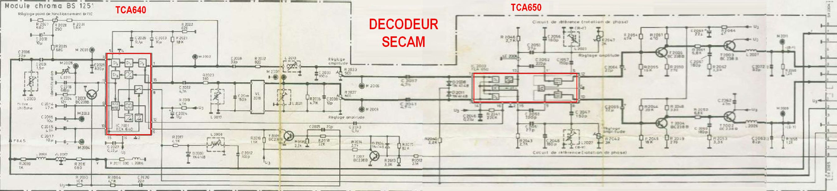 En effet, j’ai reconstitué le schéma du décodeur chroma, il n’est que SECAM car il n’utilise que le TCA640 et le TCA650 (pour avoir aussi le PAL il faudrait en plus un TBA540 et un quartz 4,43 MHz).