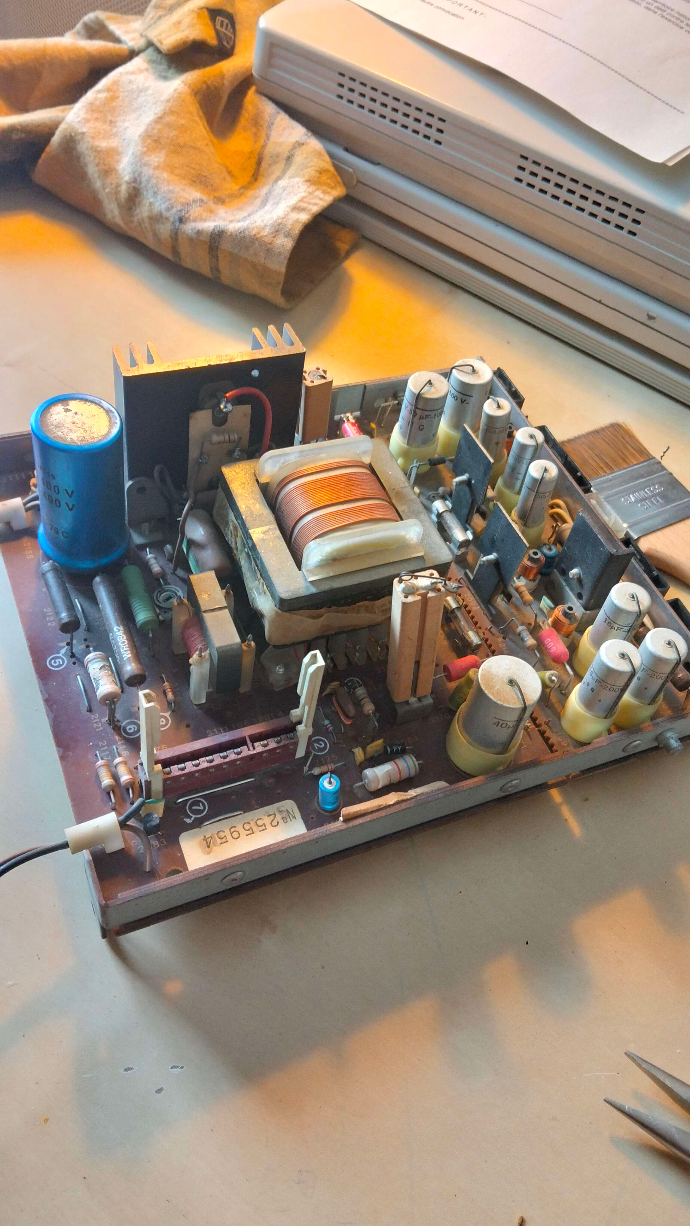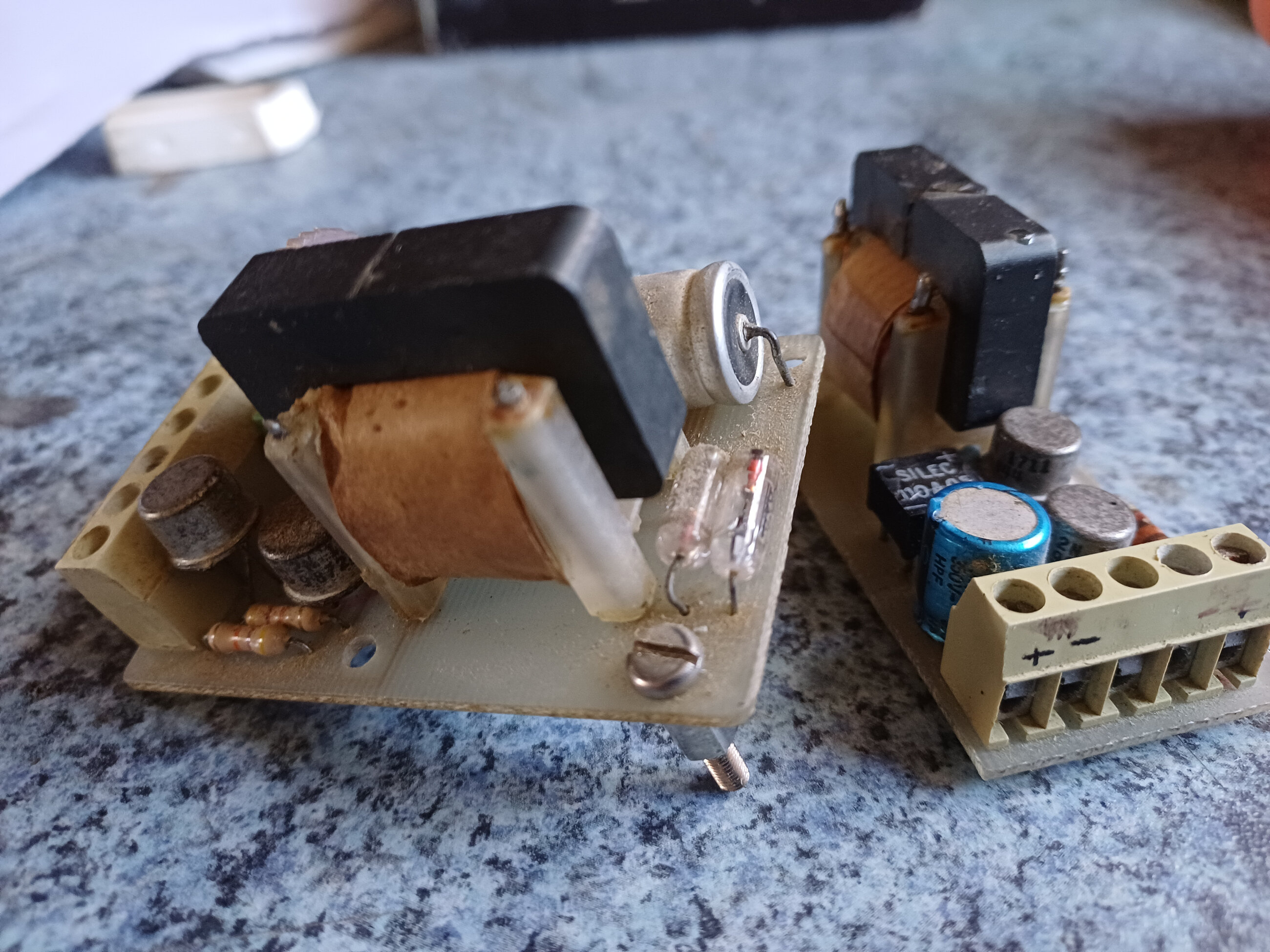 Je suis actuellement en train de réparé une télévision Philips 26C875 que j’ai obtenu en 2020. Après 4 jours d’utilisation, la télé c’est subitement éteinte. Plus un seul volt ne sortait de l’alimentation. Je l’ai laissé de côté pendant des années et j’ai enfin trouvé le courage de la réparer. J’ai pu tracer le problème à 2 résistances (que j’ai déjà remplacer) et à un petit transformateur, juste à côté du gros, qui a un bobinage ouvert.