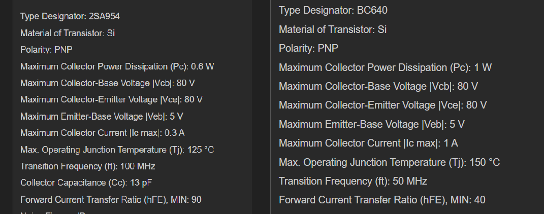 Reste le A954 et en regardant vite fait sa datasheet, un BC640 pourrait convenir bien que le hFE du BC640 soit plus faible.