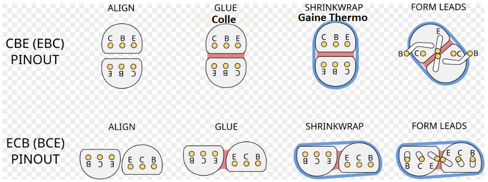Dans mon cas, je l’avais remplacé par 2 ksa992 collés dos à dos avec de la Glue. J’avais également mis des mini tronçons de gaine thermo autour des pattes pour pouvoir les plier afin de les faire correspondre au 5 trous du circuit imprimé.