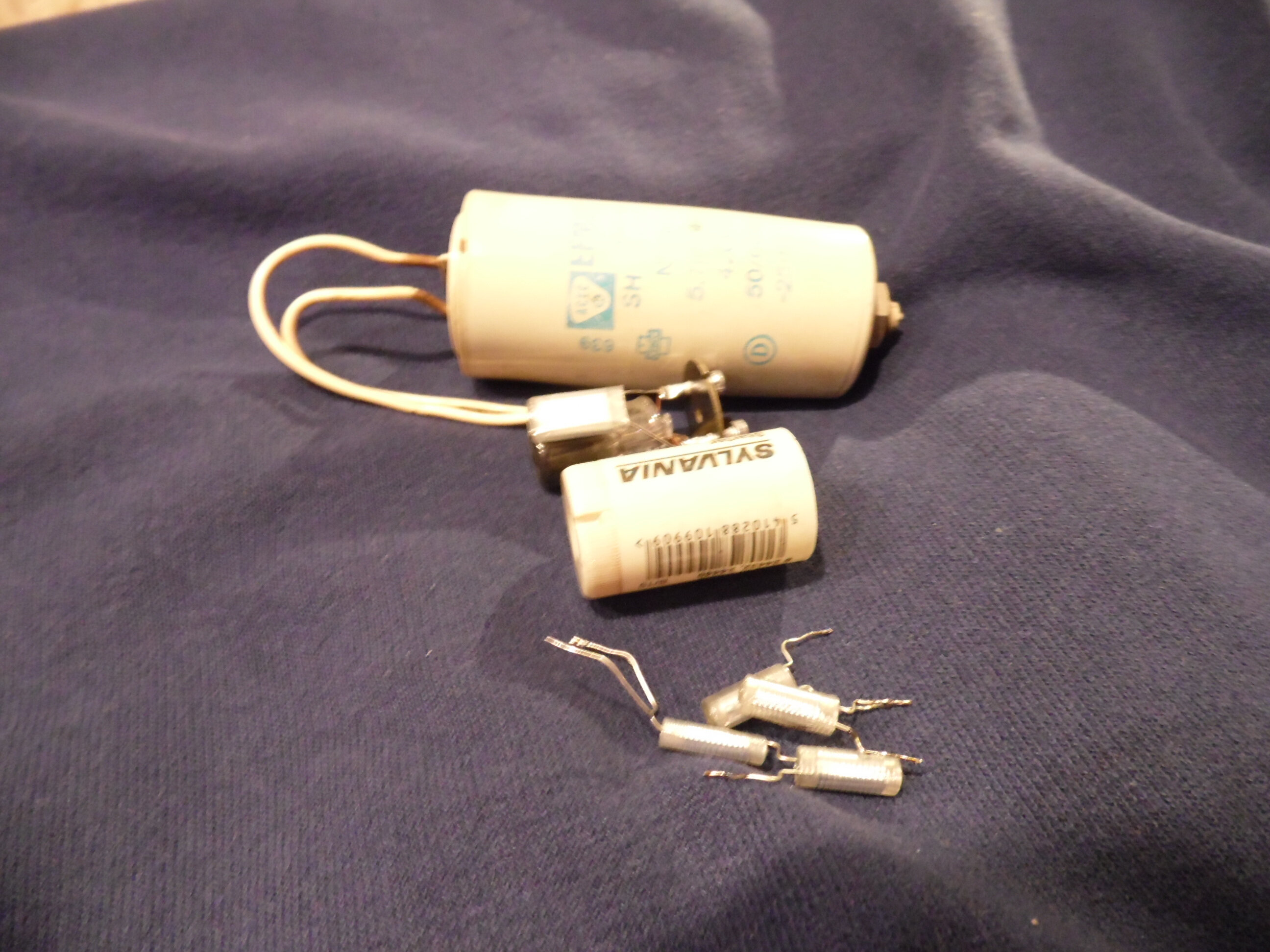 Les gros condensateurs font 5 à 8µF (réemploi possible en radio, pour filtrage HT , ou en récatance série pour alimenter un tous courants 110v sur secteur 220-230V ) les petits condensateurs inclu dans les starters Sylvania font 4 à 6nF (réemploi possible en antiparasite secteur au primaire du transfo d’alimentation, ou en atténuateur d’aigu au primaire du transfo de sortie, en radio à tubes )