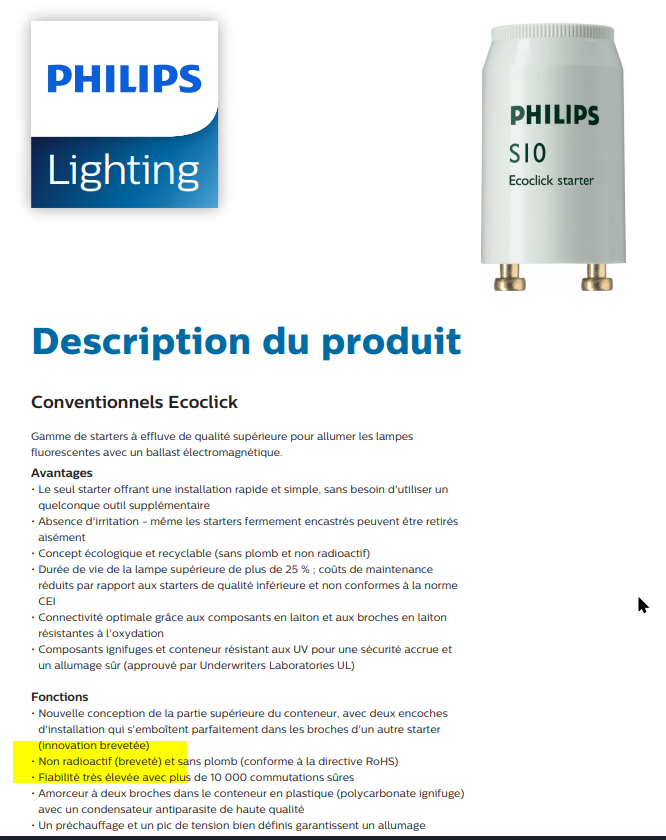 Les starters récents, tels ceux présentés ici, sont non radioactifs (c’est marqué dessus !), leur électrodes ne sont plus dopés et leur gaz est différent, ce genre d’utilisation détournée possible à l’époque (avec des doutes sur l’efficacité !?) ne le serais plus de nos jours .