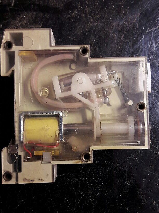 Jour de pluie et d’orage aujourd’hui, je viens de retrouver dans mon broc ce relais temporisé au mercure. Le mécanisme et la tempo fonctionne encore très bien. Je suis surpris car c’est déjà un appareillage modulaire et je pensais que l’utilisation du mercure pour les contacteurs étaient interdits depuis longtemps.