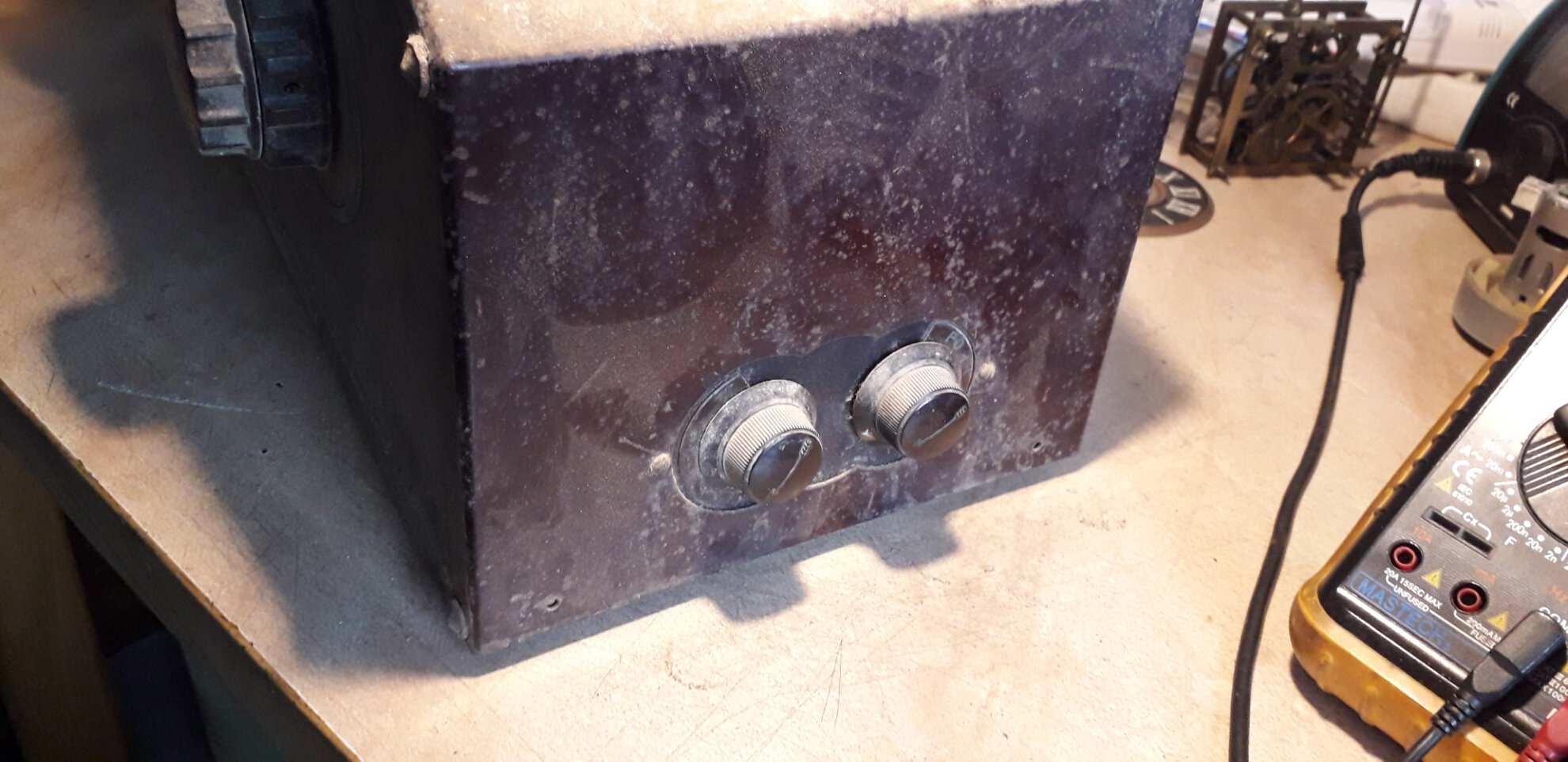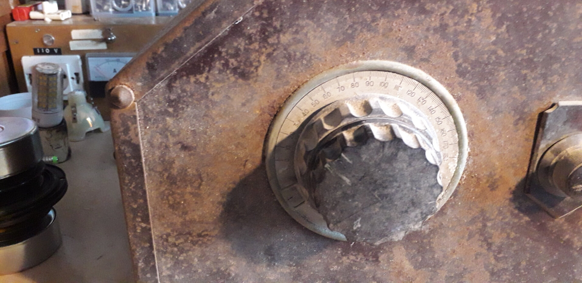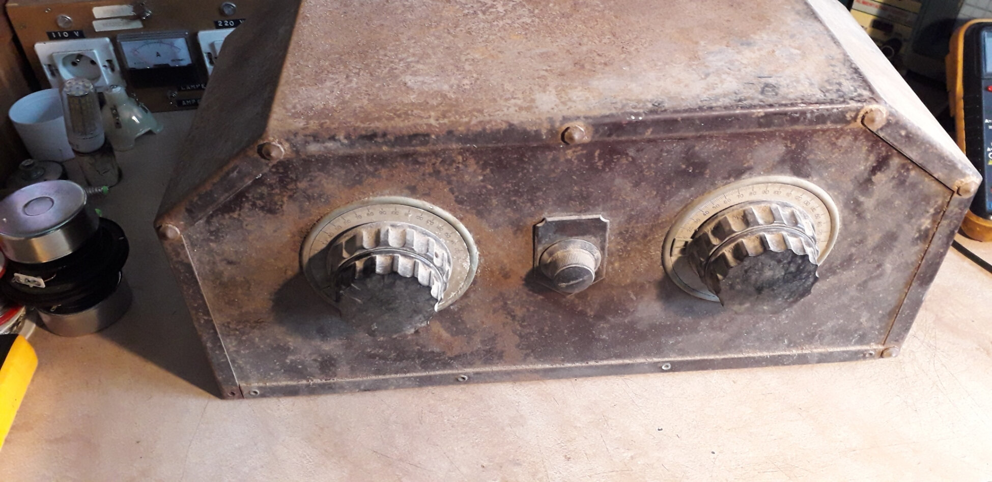 cette lampe sert de fusible visiblement. Faut estimer les VA, 50-80VA? En supposant que la position 230V existe, une 500mA 6-12V? Aucun risque d’essayer sauf pour la pov’ loupiote… après la remise en état évidement…