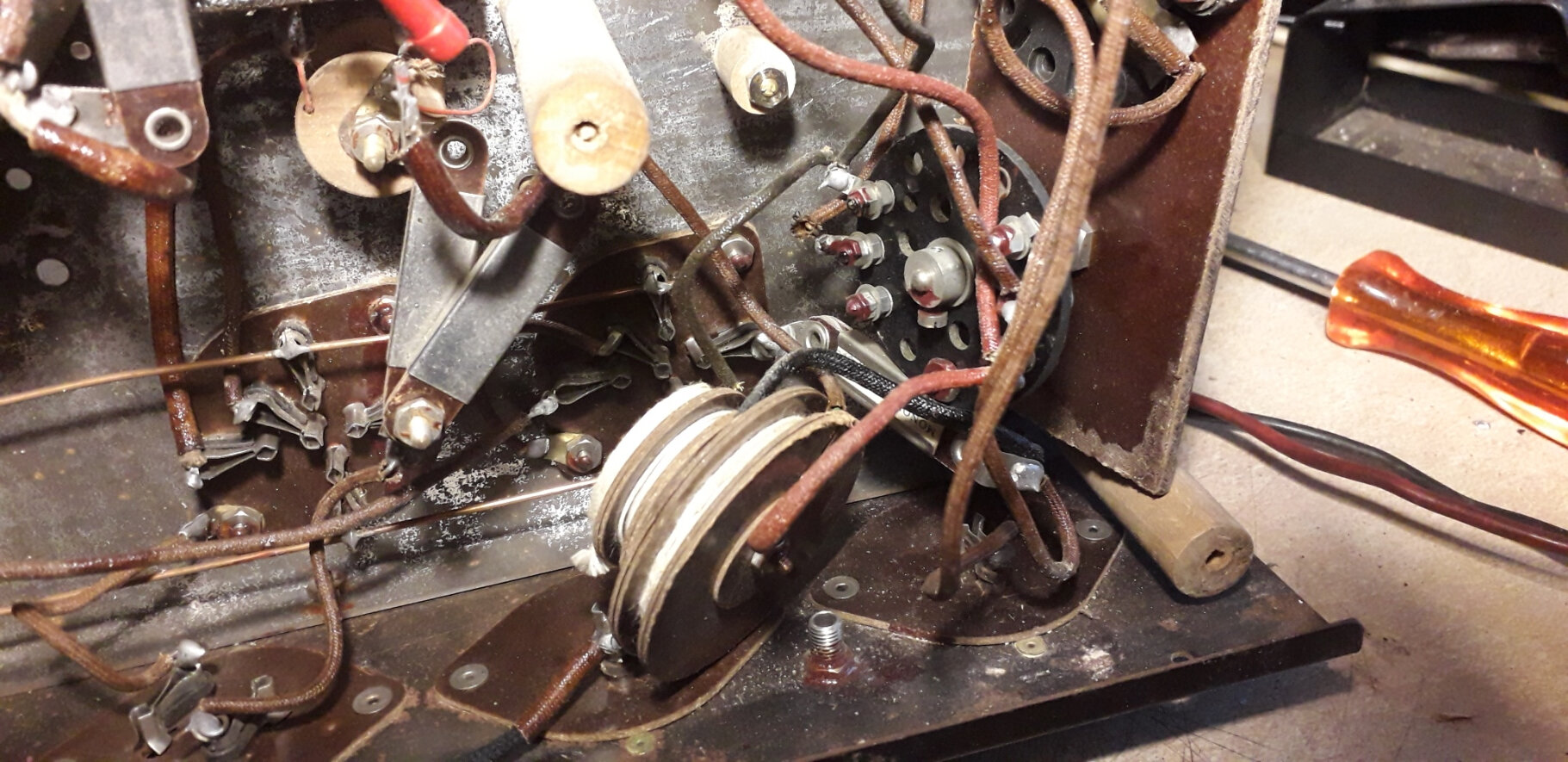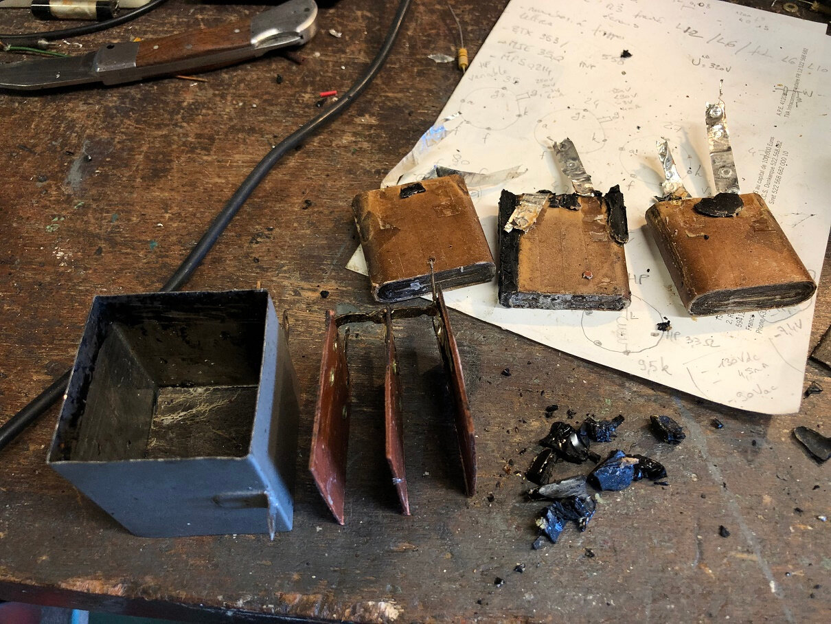 La valeur des capas étaient en relief dans le brai qui ferme les boites métalliques. J’imagine qu’il y a une boite filtrage alim, une boite découplage HF. Je conseille de faire une entorse à la restauration et de souder chaque découplage directement sur les supports de lampes. J’ai privilégié l’esthétique en cachant les condos neufs dans leur boite et la radio accroche parfois.