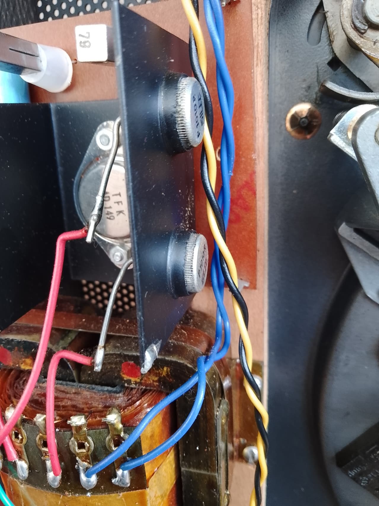 Lorsque je rapproche l’ensemble pour éventuellement le recoller je trouve que la liaison est très courte, le fil rouge est très tendu ! Je me demande si la connexion sur la platine ampli (en haut dur la photo est le bon endroit, en plus j’ai trouvé sur le dissipateur de l’alimentation (photo 2) un point de soudure sans connexion (photo 3)