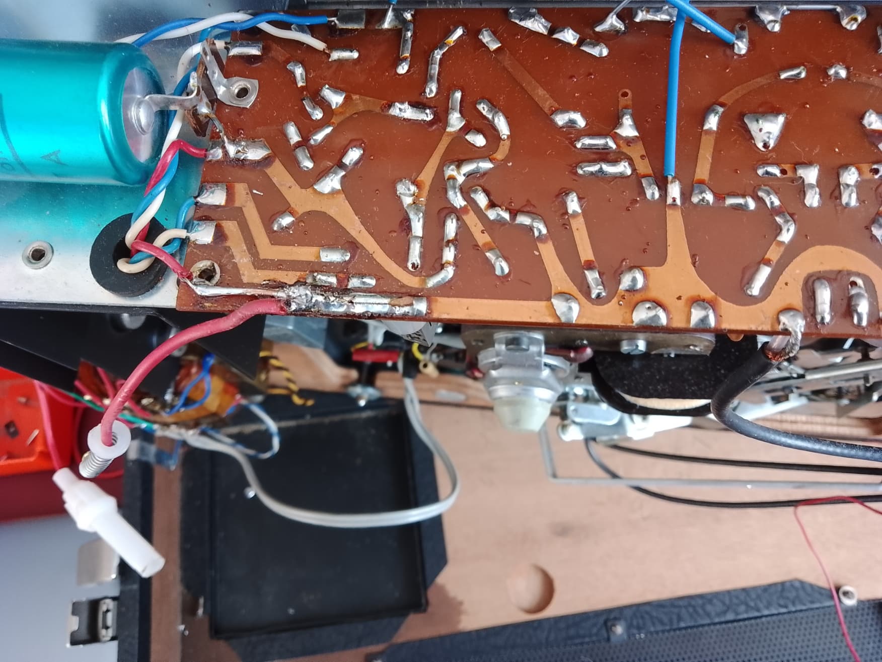 D’après vos photos, cet électrophone a été bricolé, à l’évidence le porte fusible n’est pas d’origine et a été soudé à l’arrache sur le circuit imprimé de la platine alimentation (comme en témoigne la vilaine soudure du câble rouge et la détérioration de la piste). Ce porte fusible est un modèle que l’on rencontrait plutôt sur le fil d’alimentation positif des autoradios d’il y a 30 /40 ans.