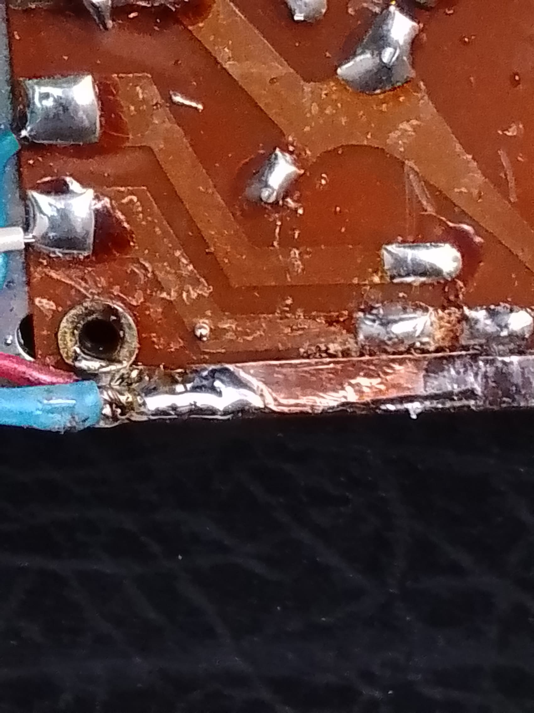 La soudure réalisée sur la platine ampli avec une détérioration de la piste jusqu’à l’œillet rivet (a gauche du circuit)