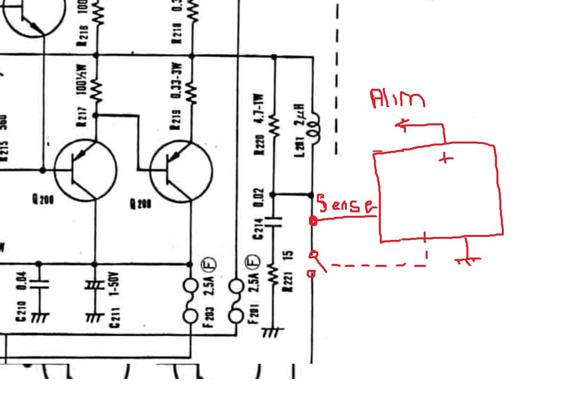 Après remplacement puis démarrage avec lampe limiteuse de courant, le bornier HP indique +35V ! ça n’est pas bon, j’ai peur qu’un des transistors de sortie soit mort, surtout cette série Toshiba au lettrage rouge qui me fait peur.