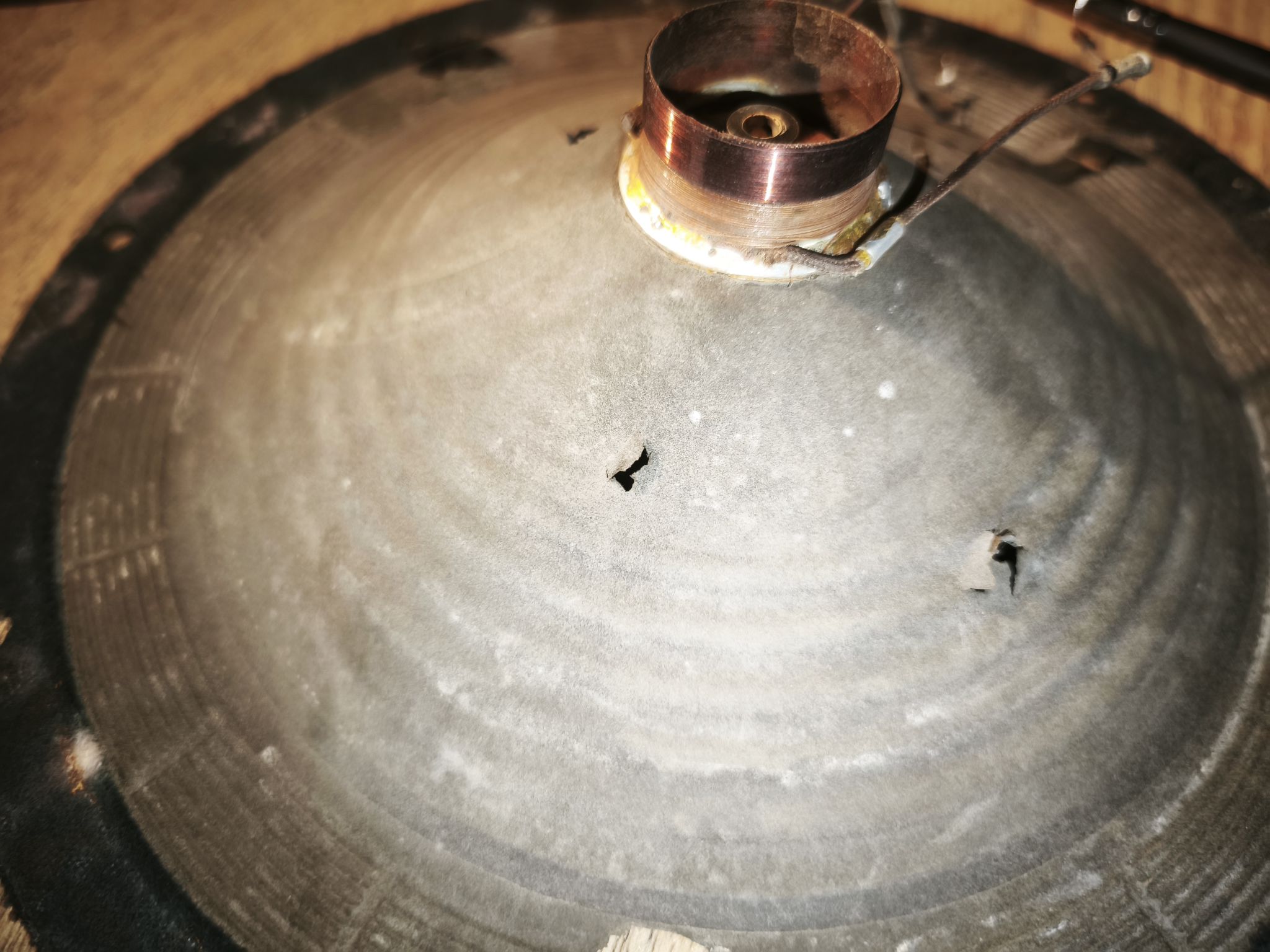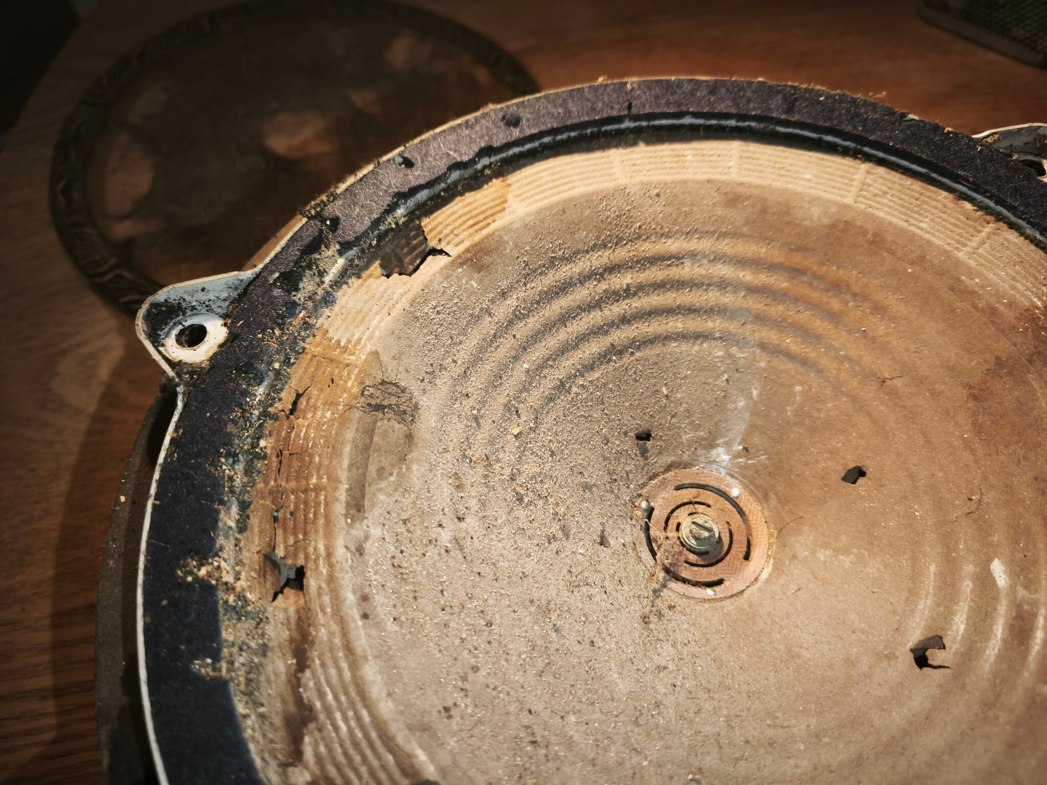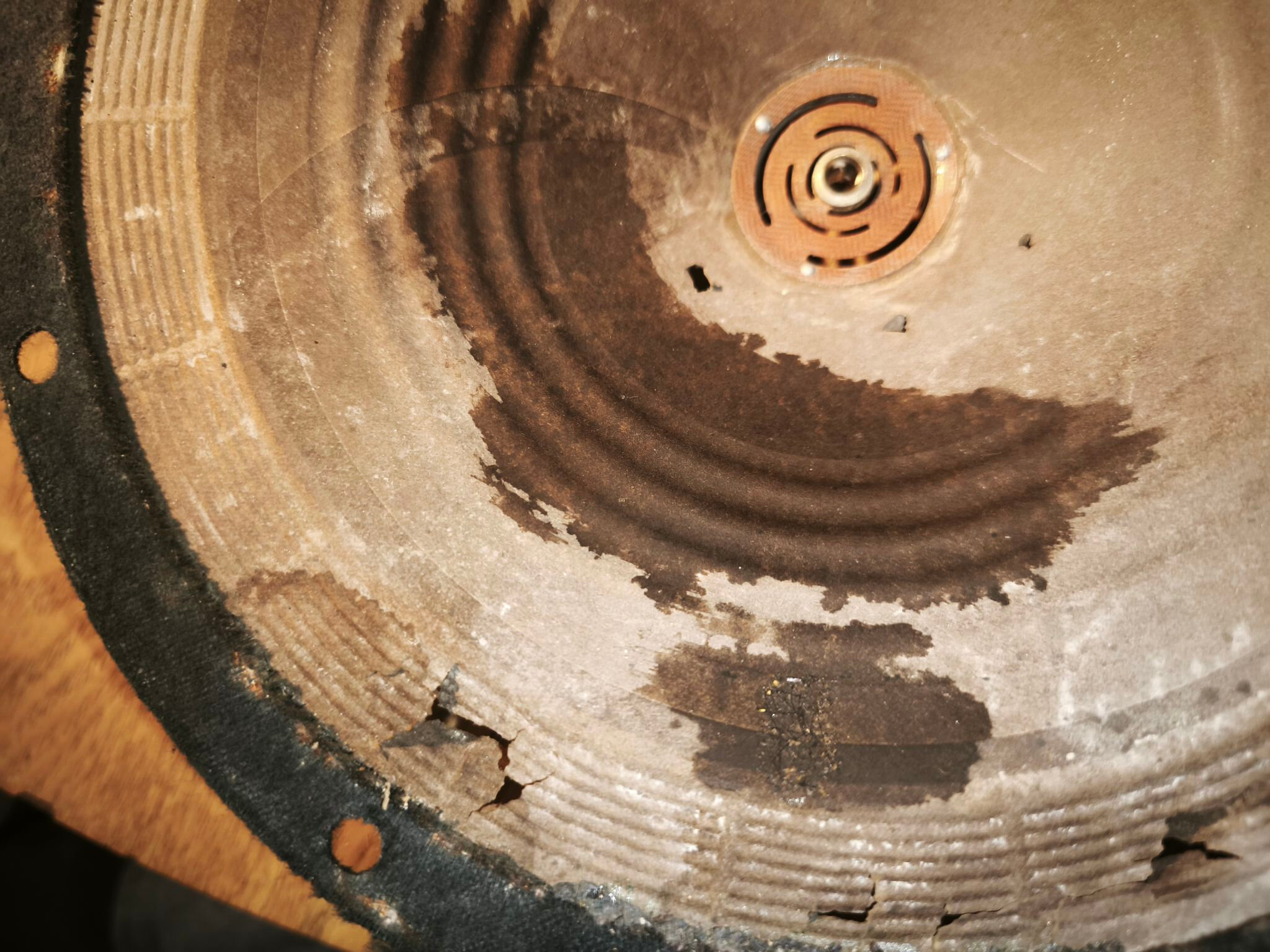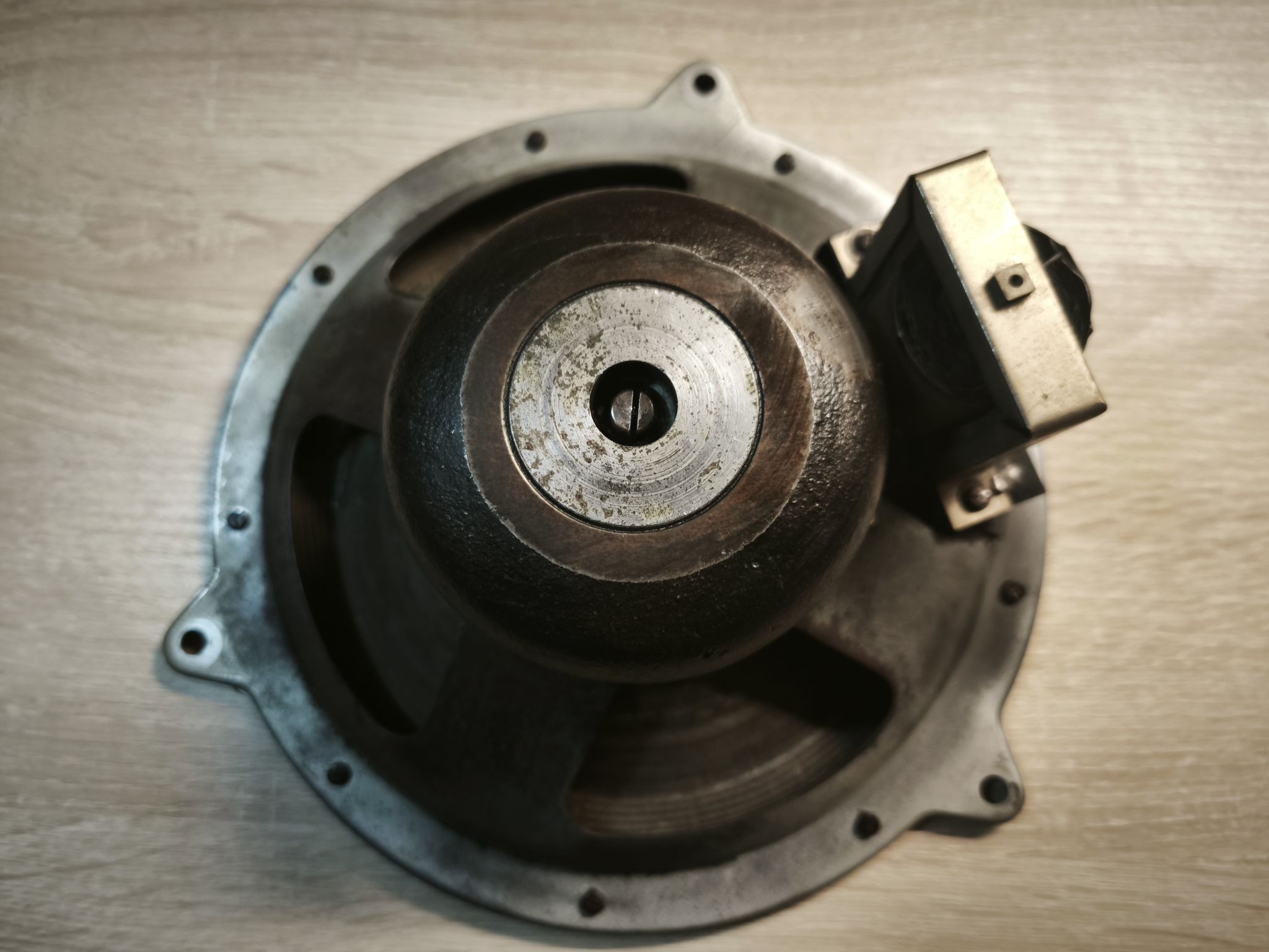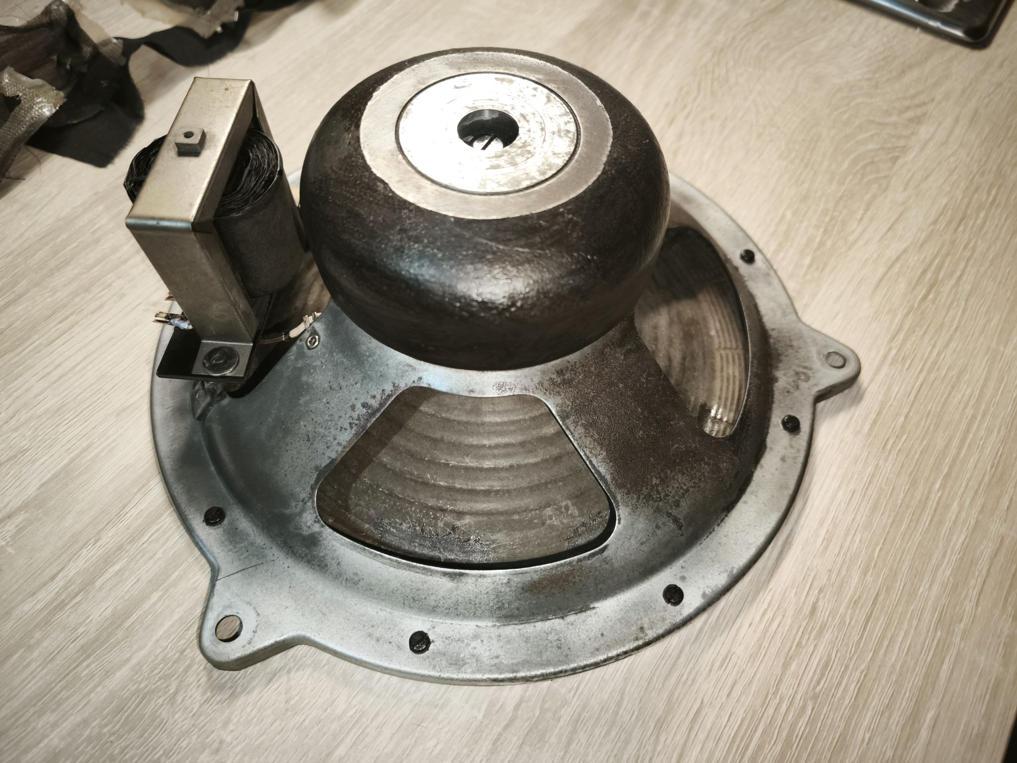Le haut-parleur est en mauvais état : la membrane est abîmée et le métal oxydé :