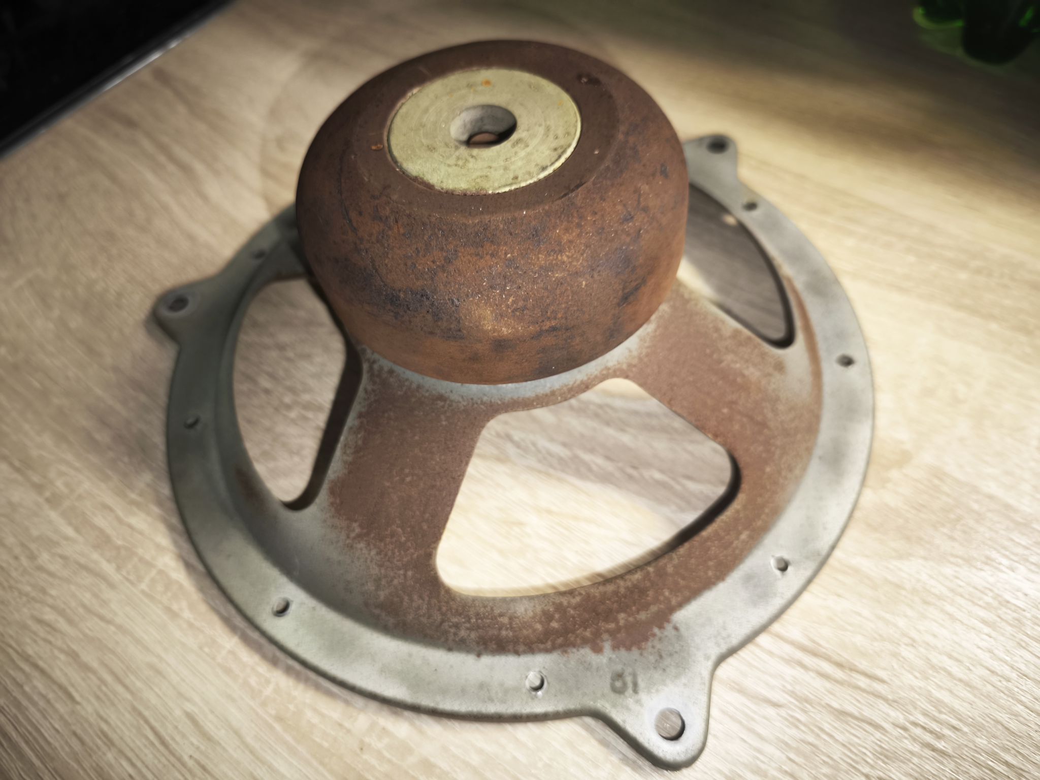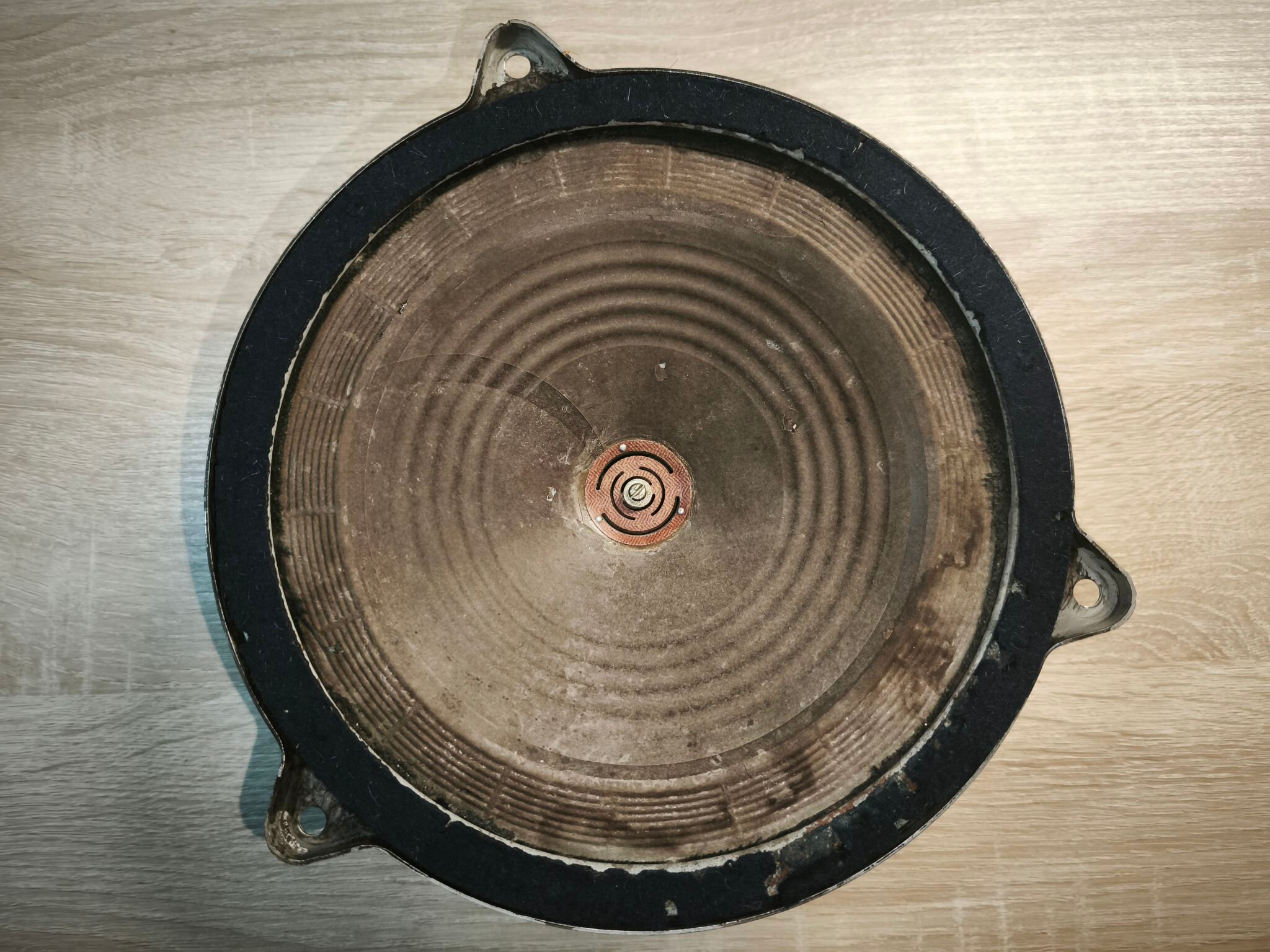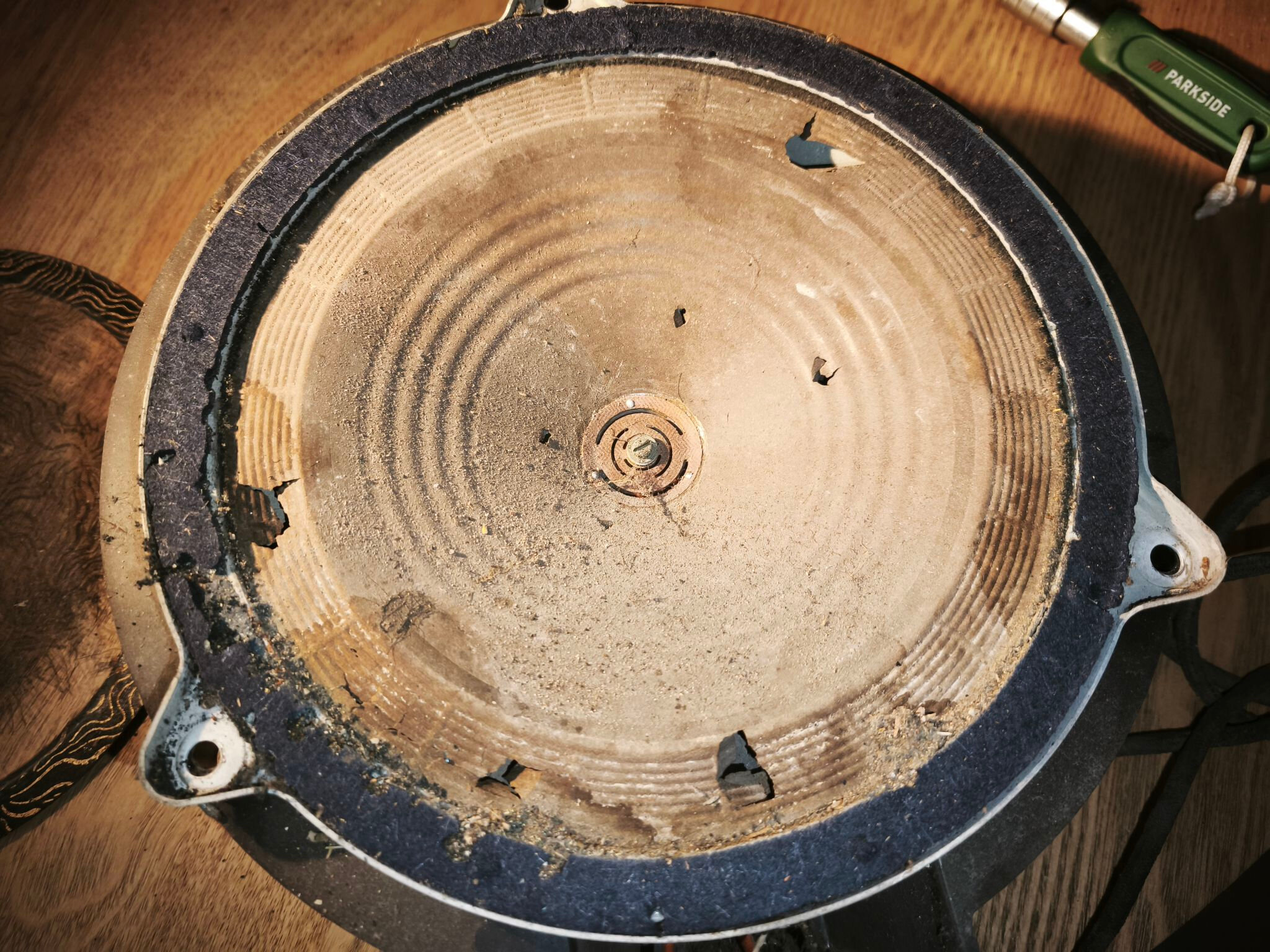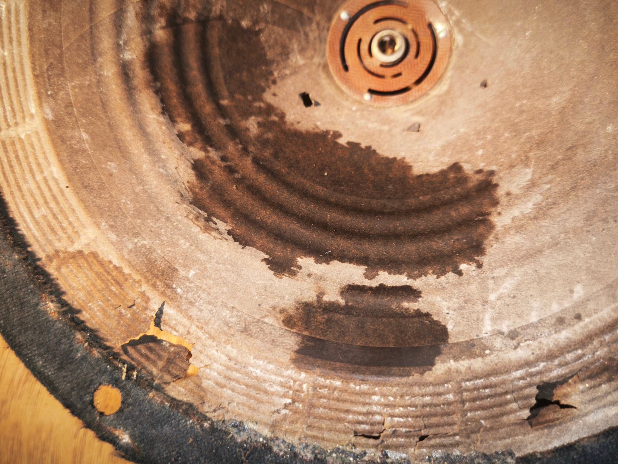 Le haut-parleur est en mauvais état : la membrane est abîmée et le métal oxydé :