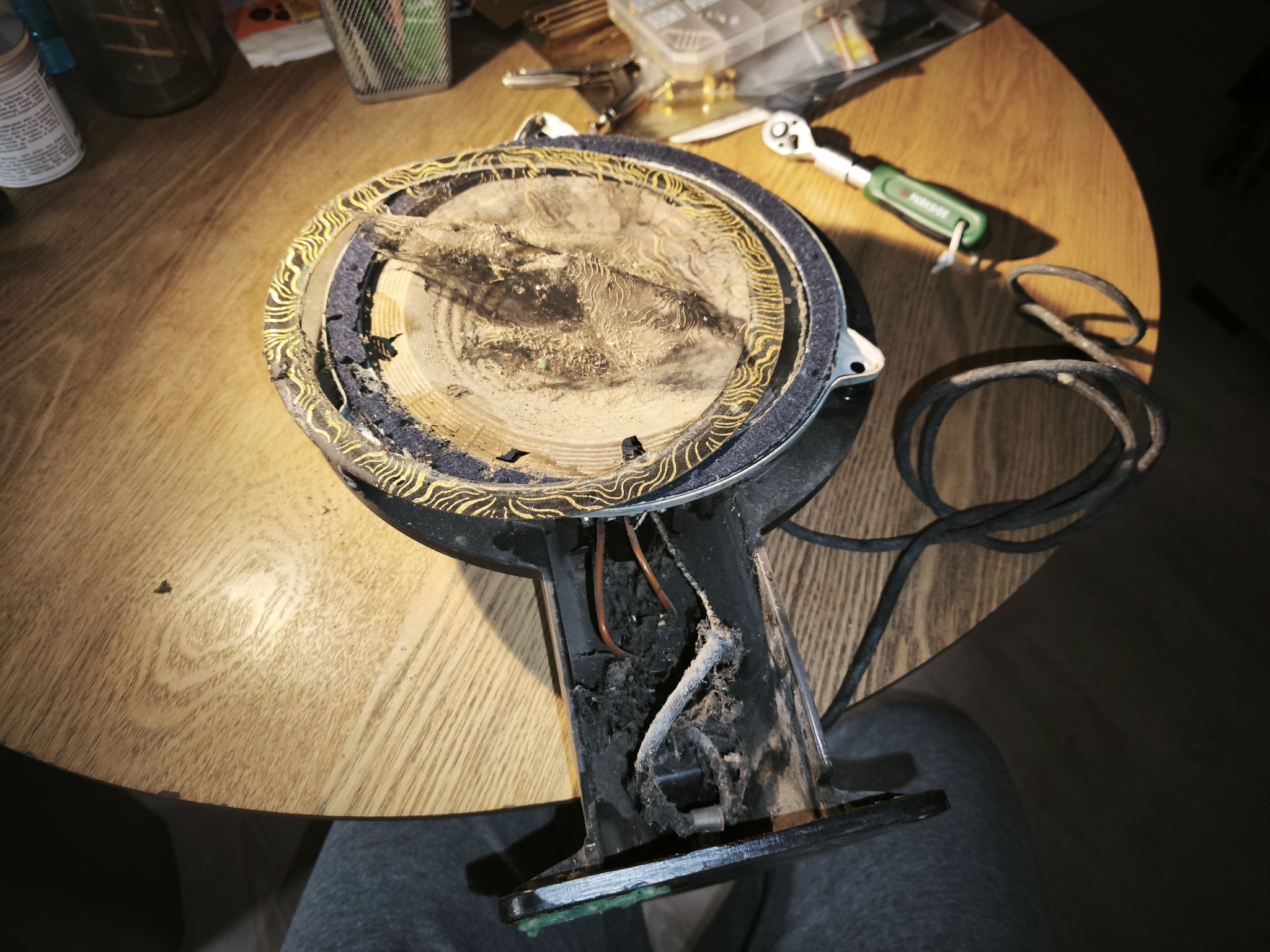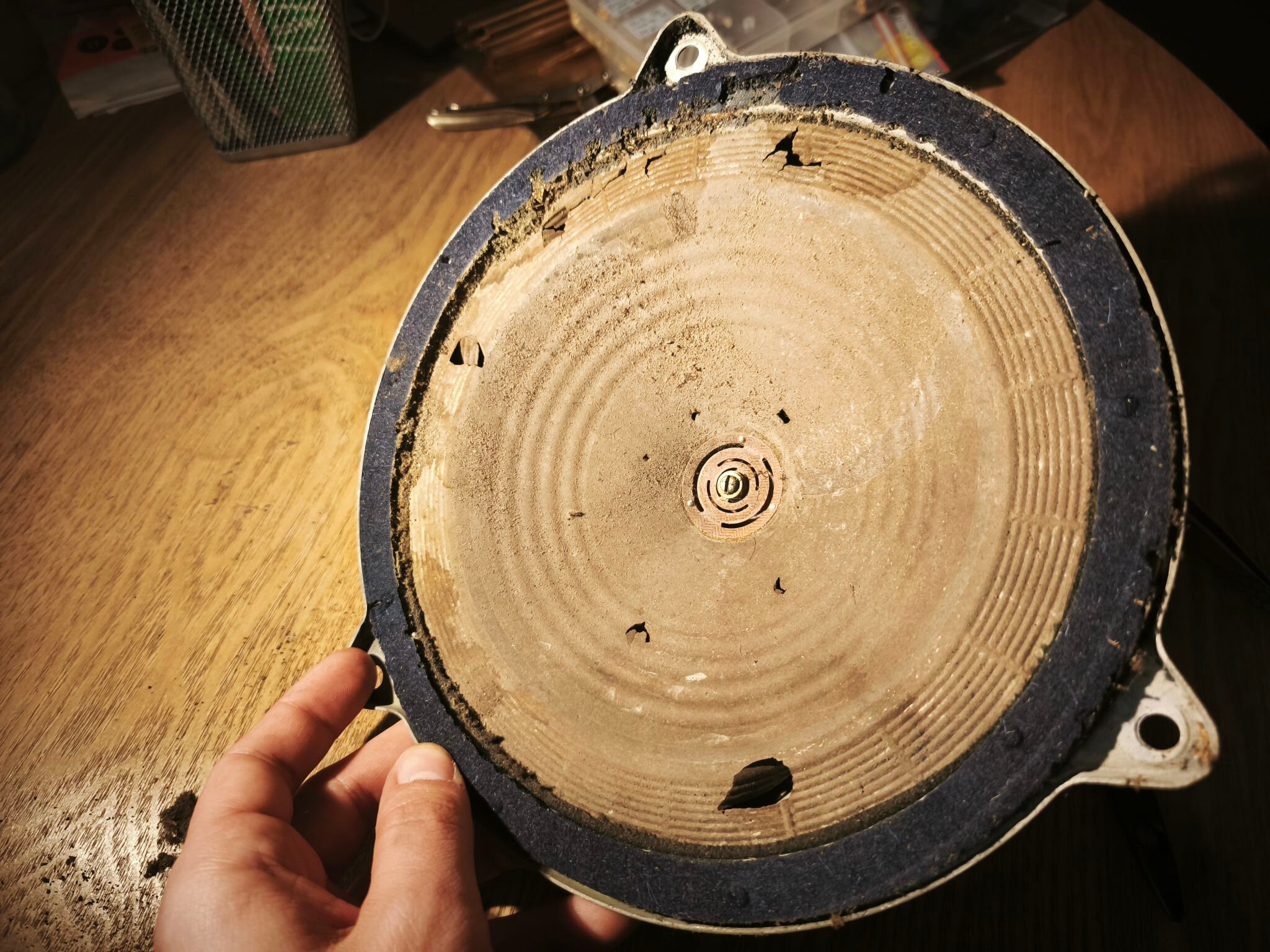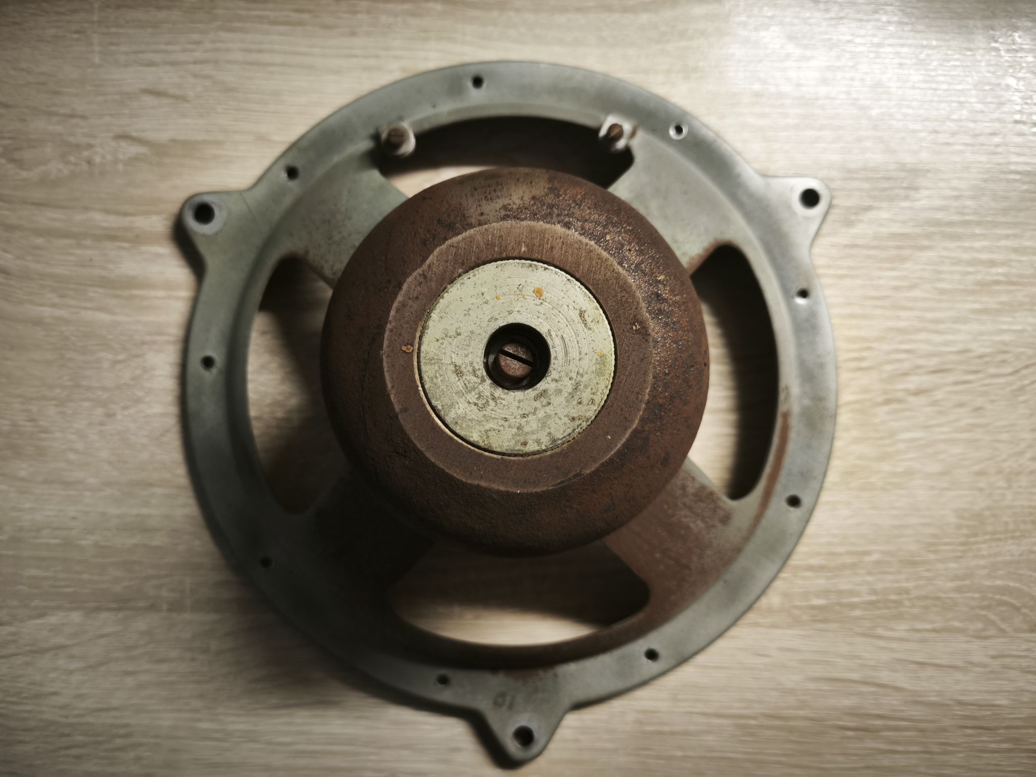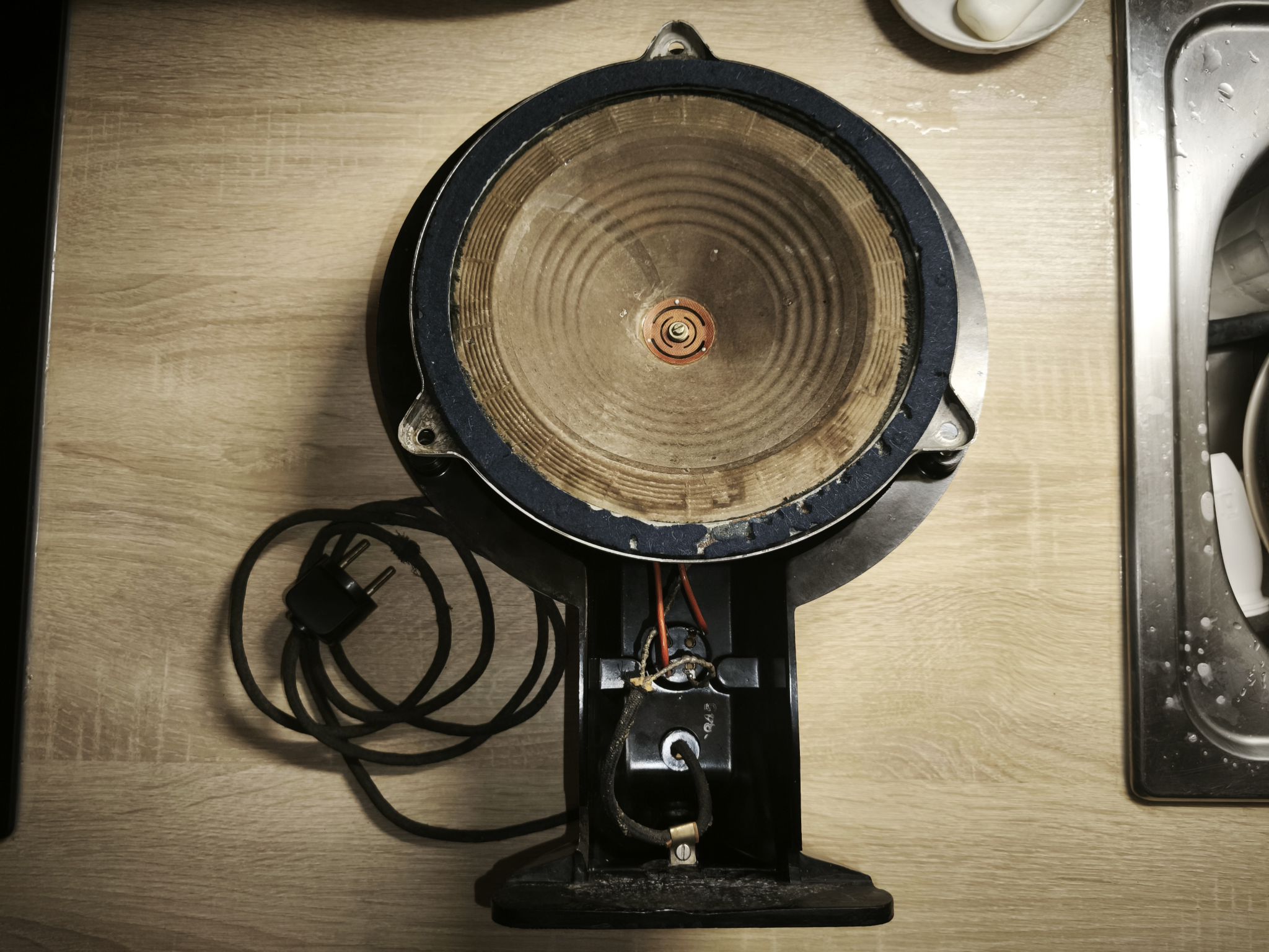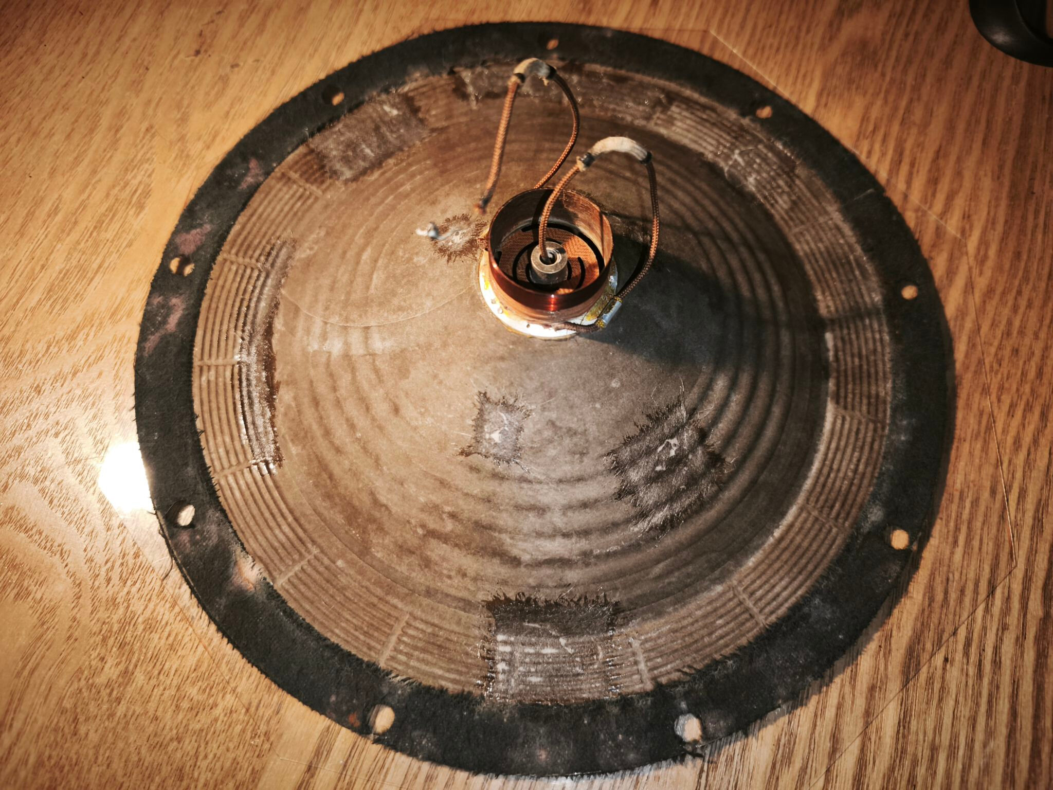 Le haut-parleur est en mauvais état : la membrane est abîmée et le métal oxydé :