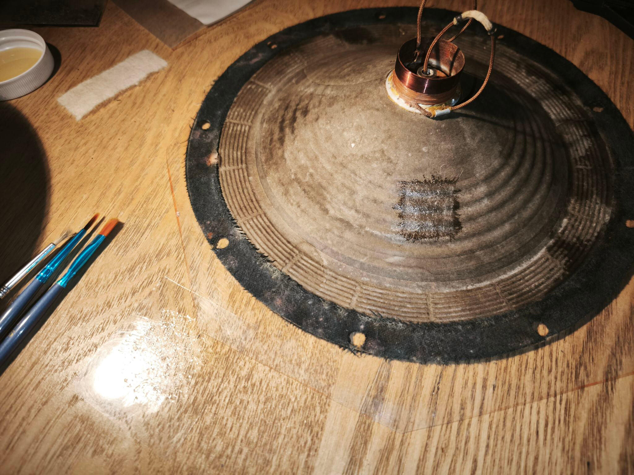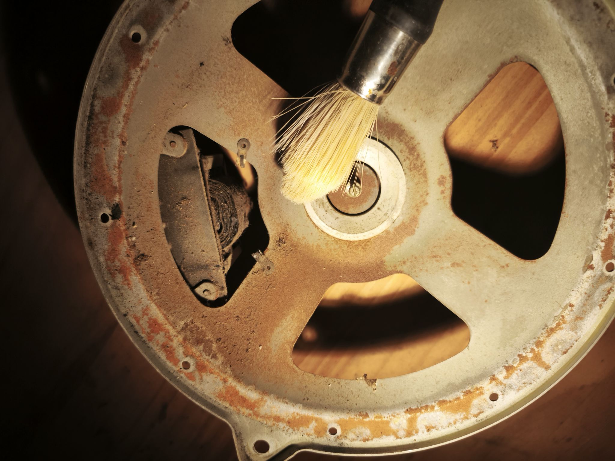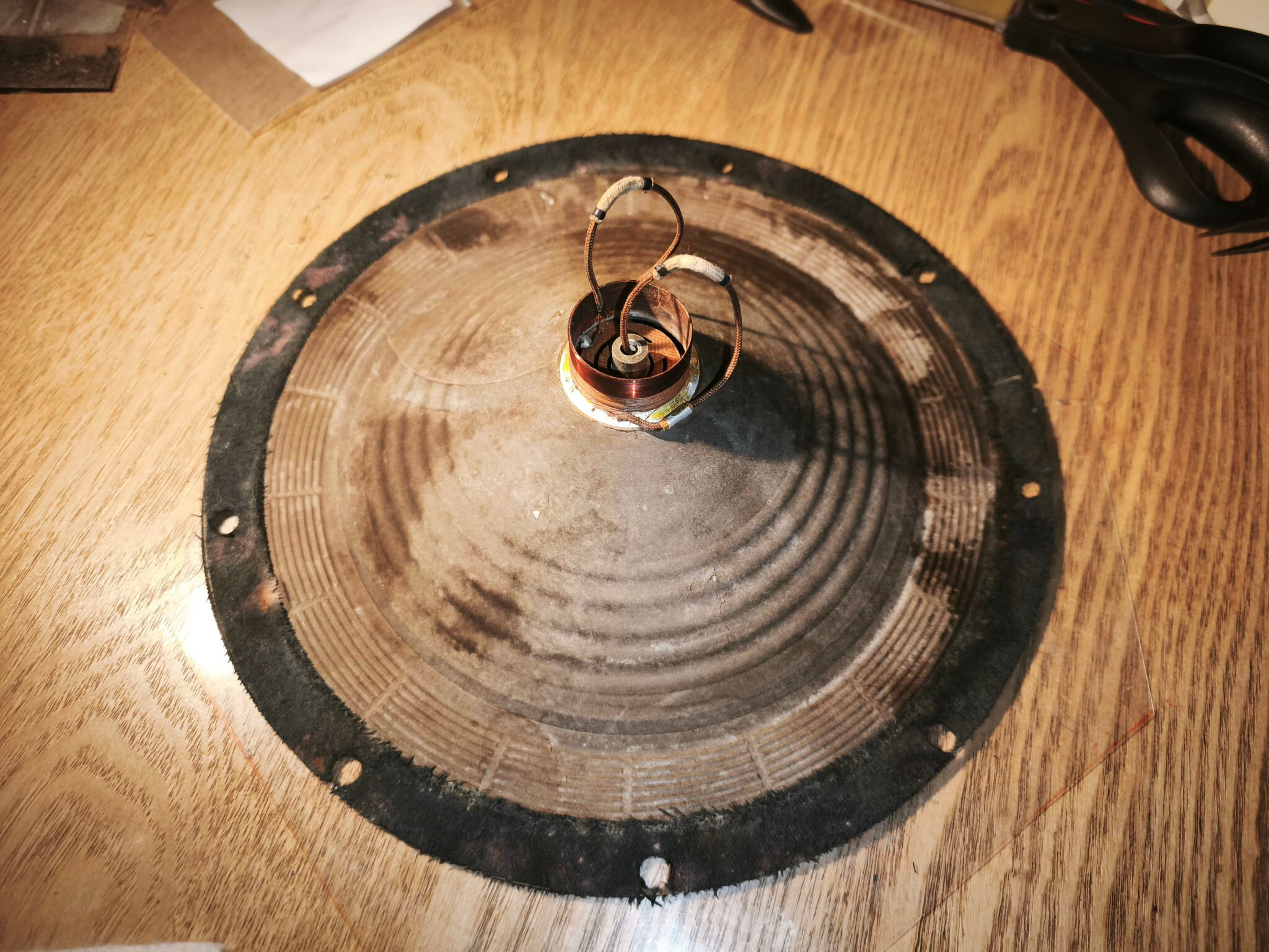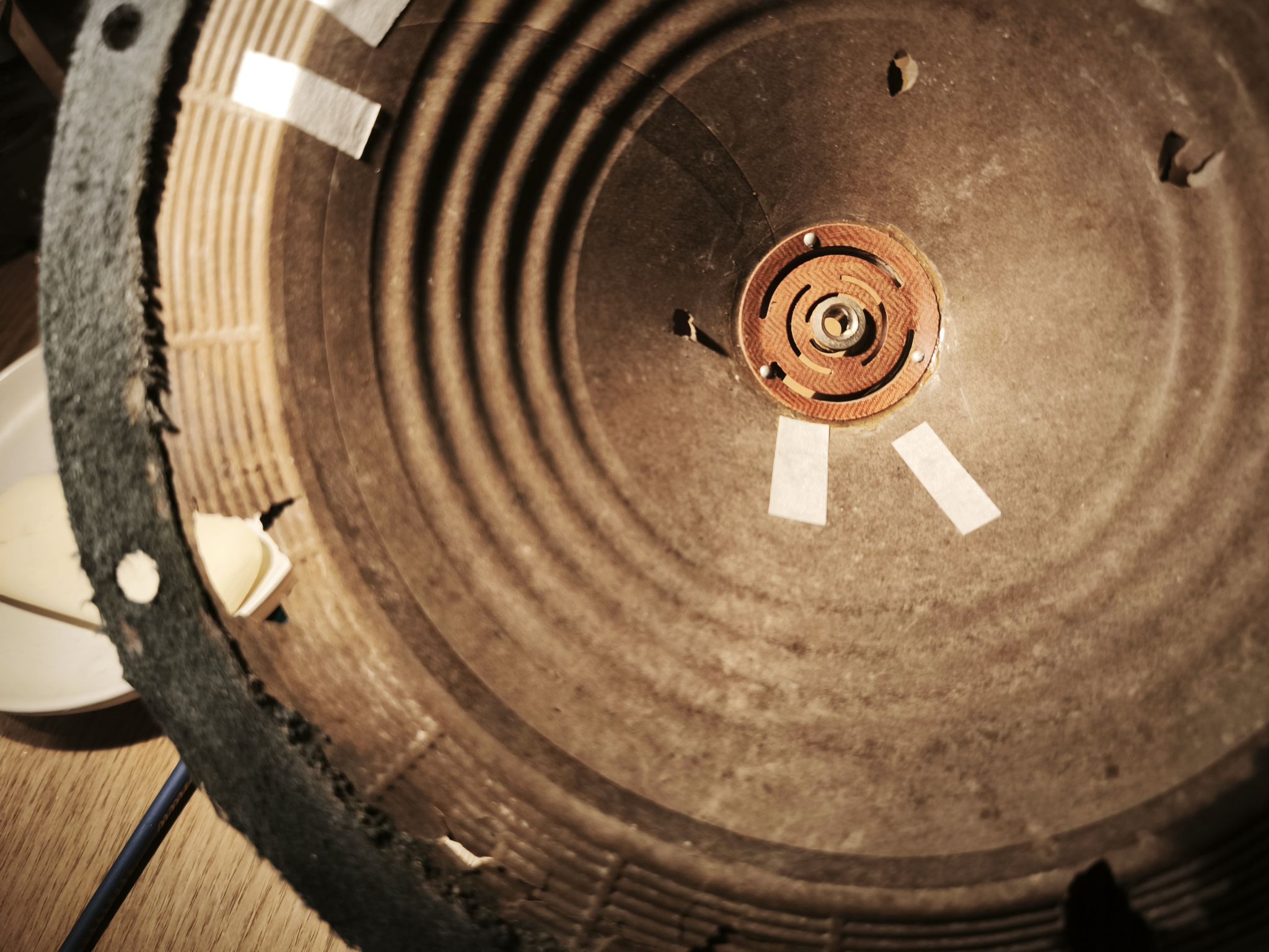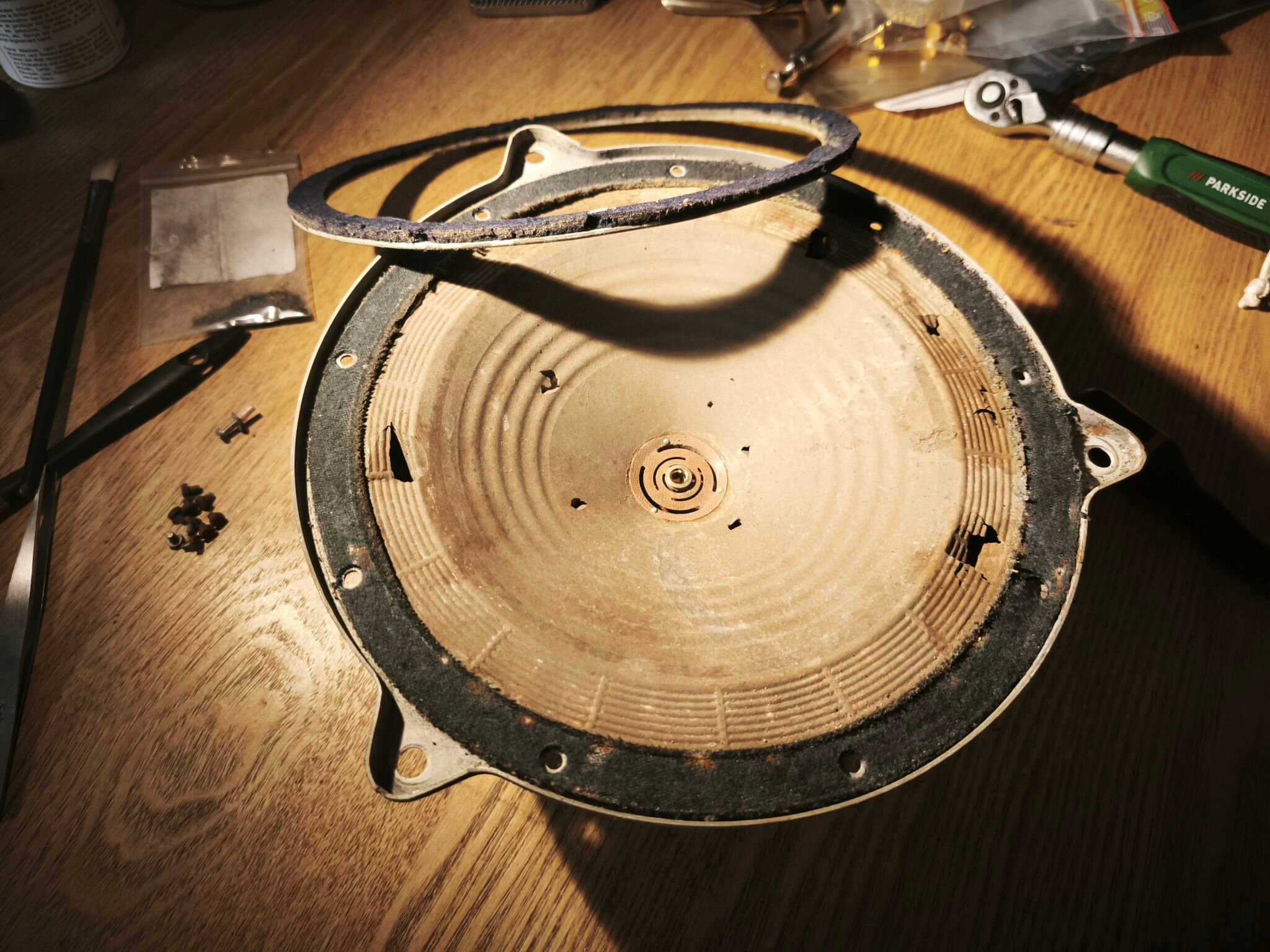 Le haut-parleur est en mauvais état : la membrane est abîmée et le métal oxydé :
