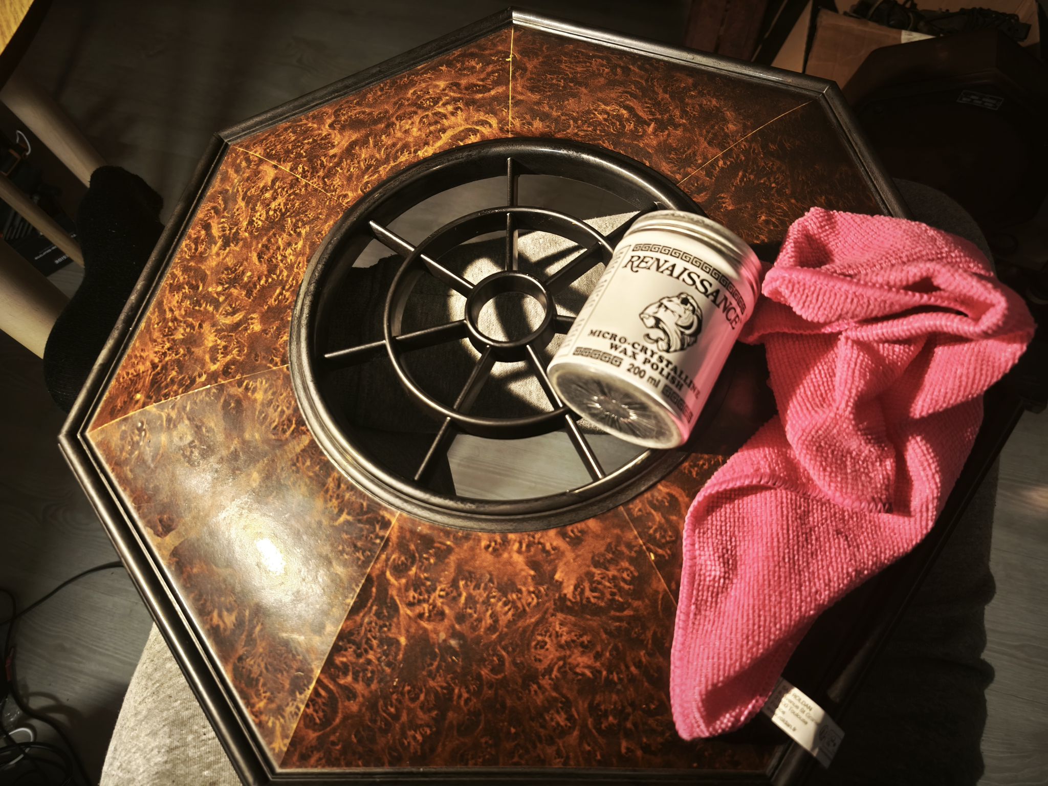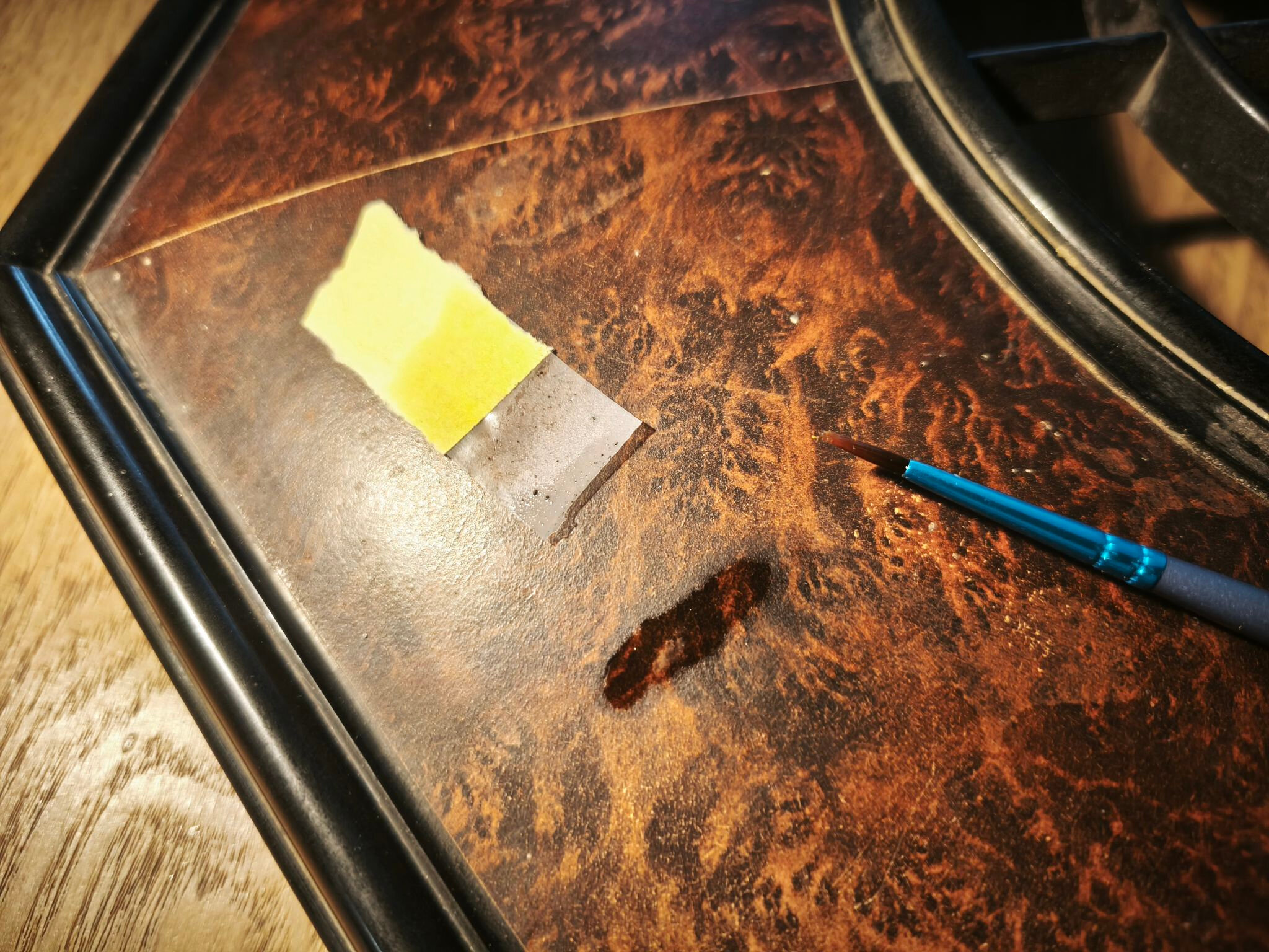 Une fois le tout sec, j’applique une cire microcristalline sur la bakélite. Elle est moins acide que les cires naturelles et assure une meilleure stabilité dans le temps.