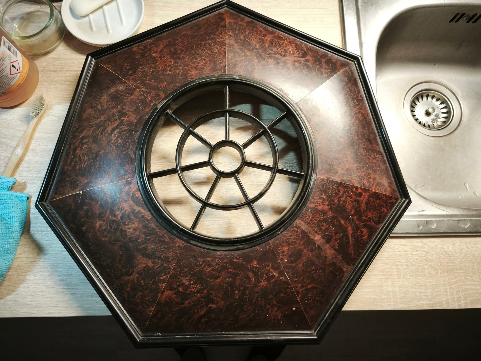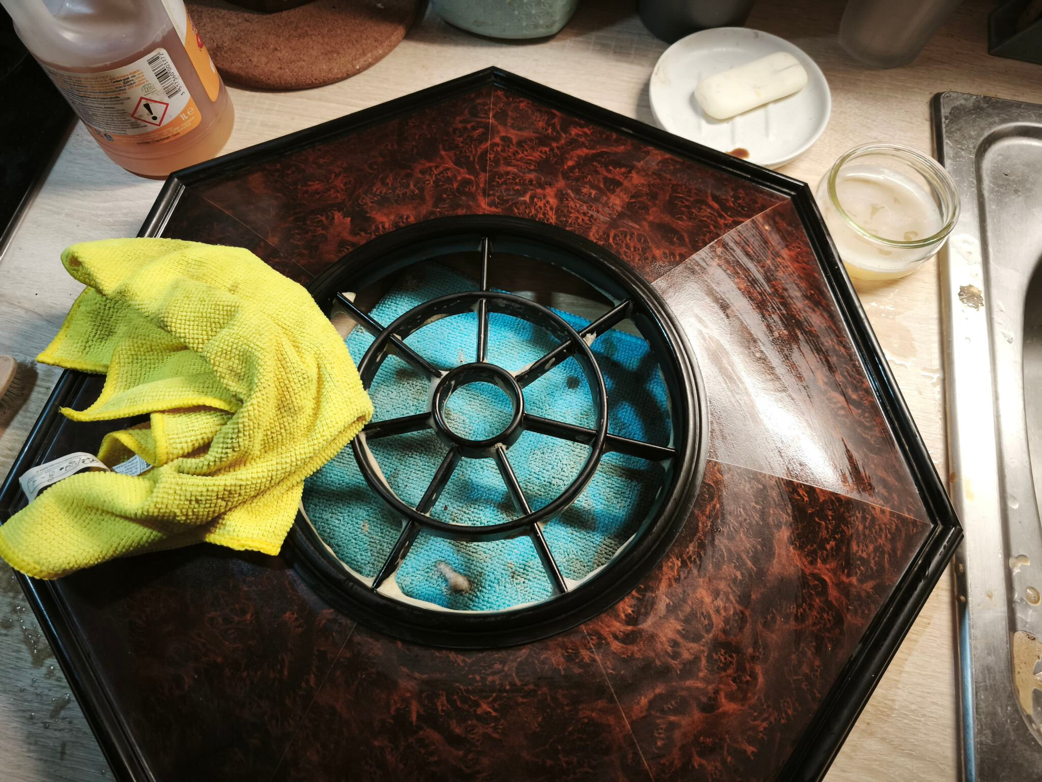 Pour la Philite, je nettoie à l’eau et au savon noir. Sur le carton bakélisé, je mouille le moins longtemps possible et je sèche rapidement :