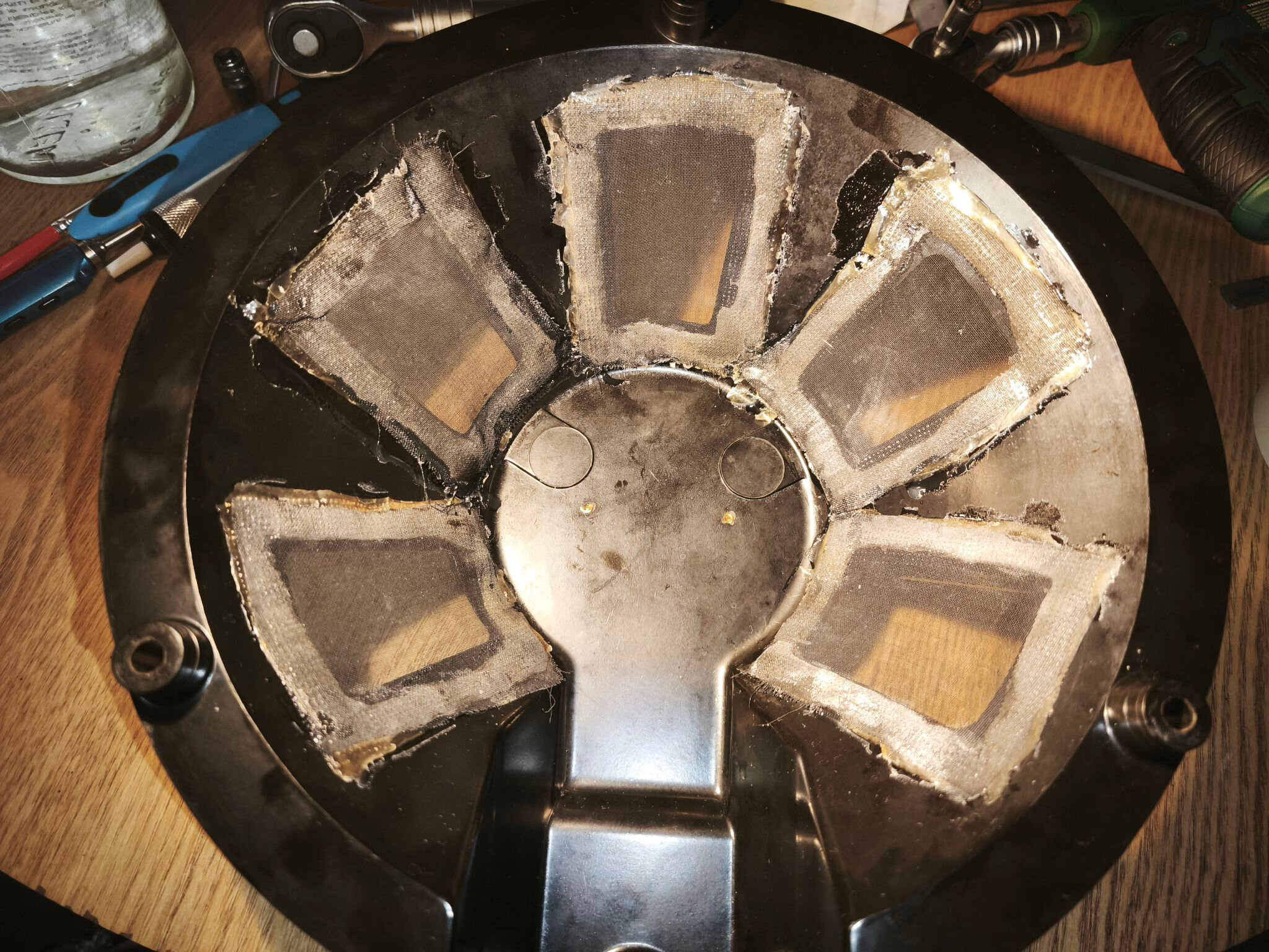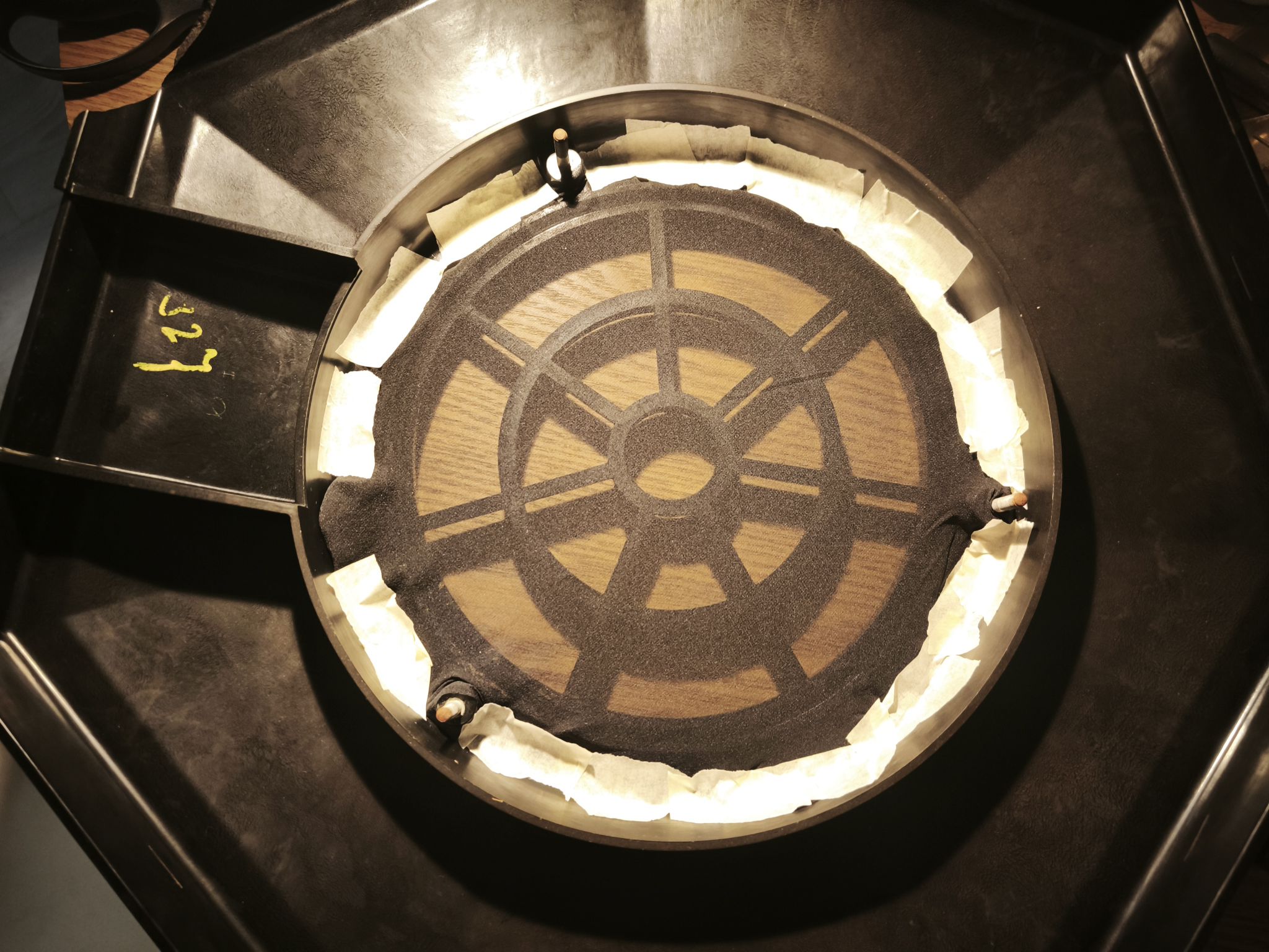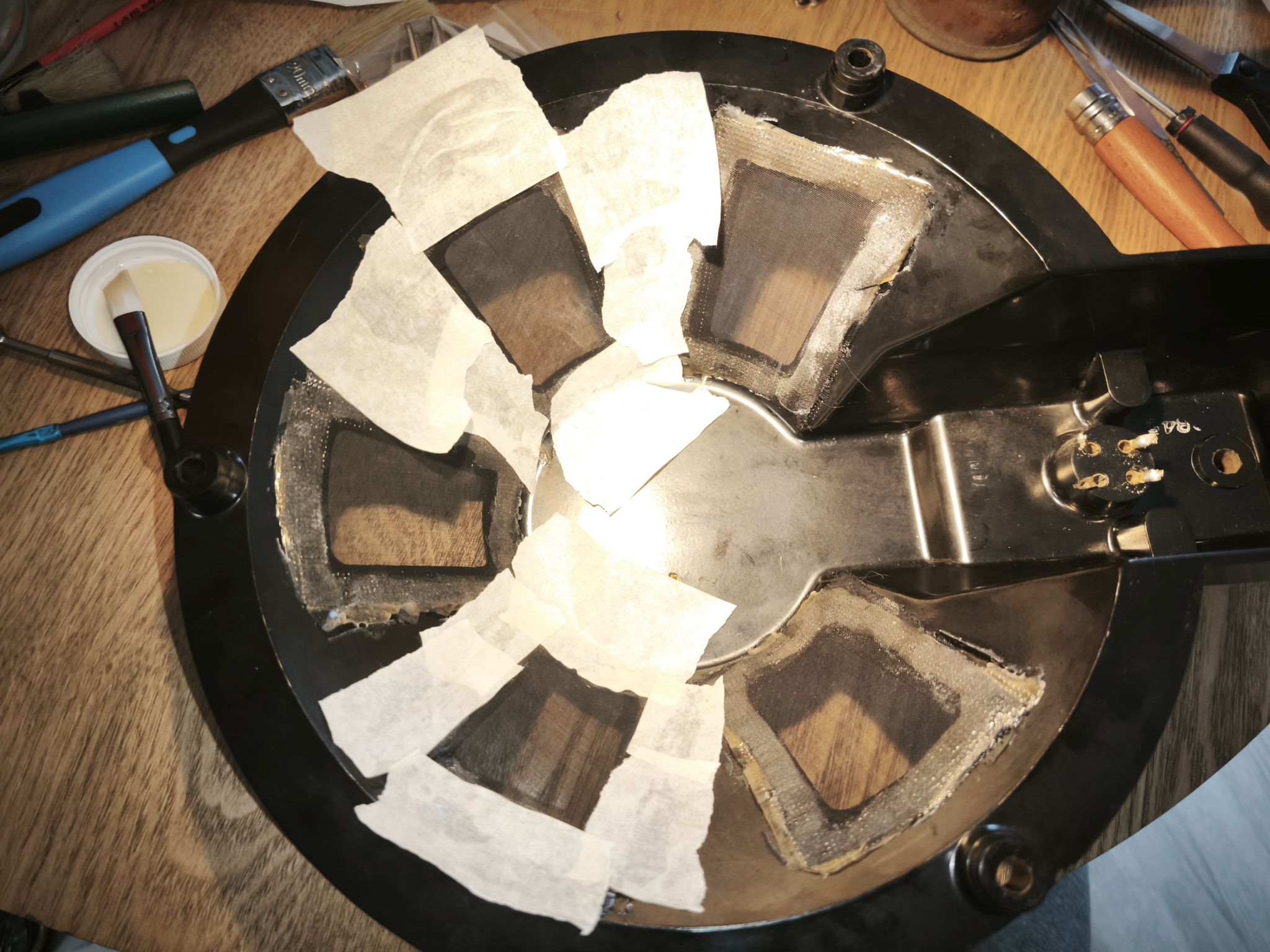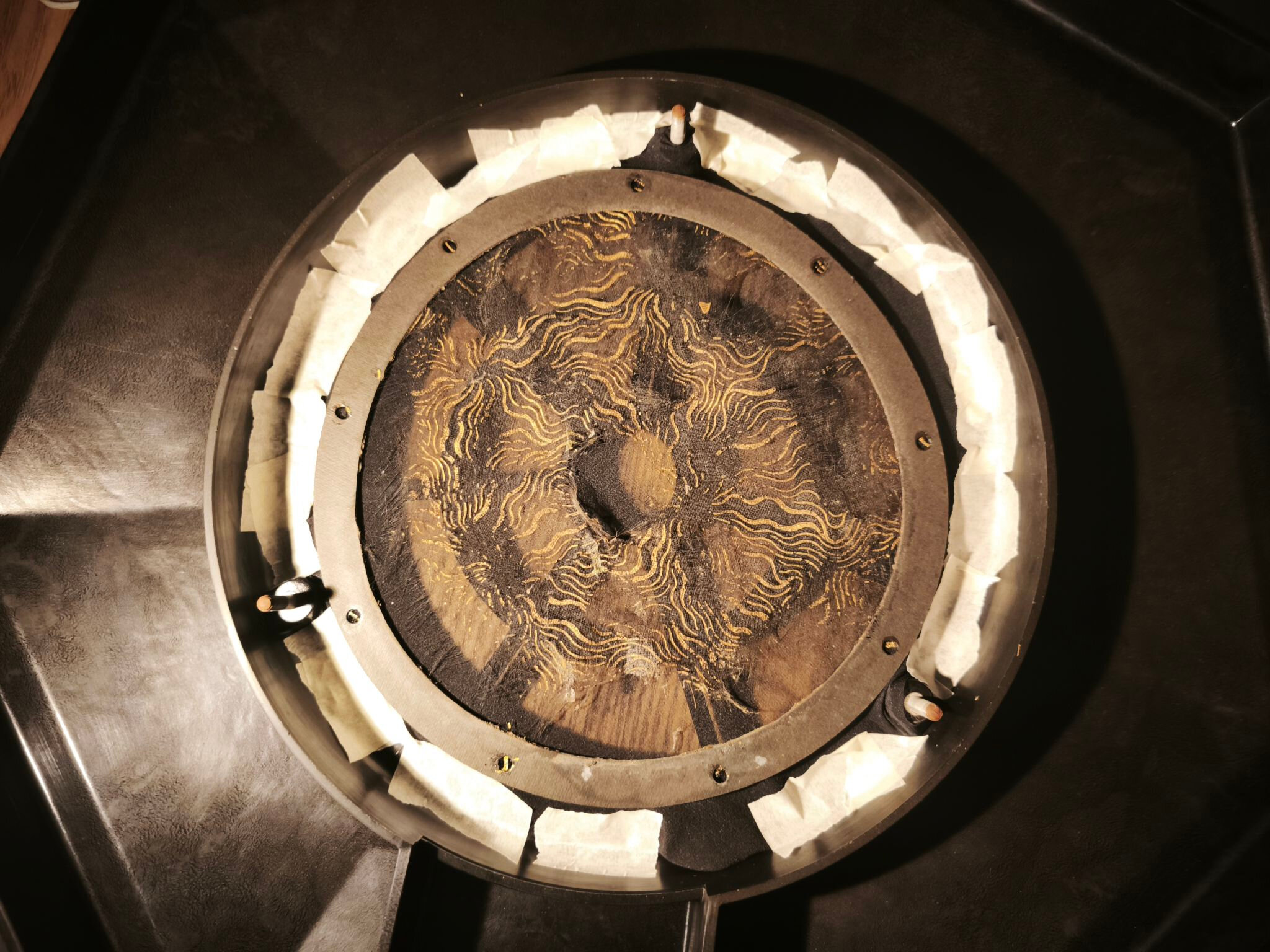 Une fois fait, retirez délicatement le pourtour en métal qui presse la suspension. La membrane devrait s’enlever sans résistance (attention : elle est presque aussi fragile qu’une feuille morte) :