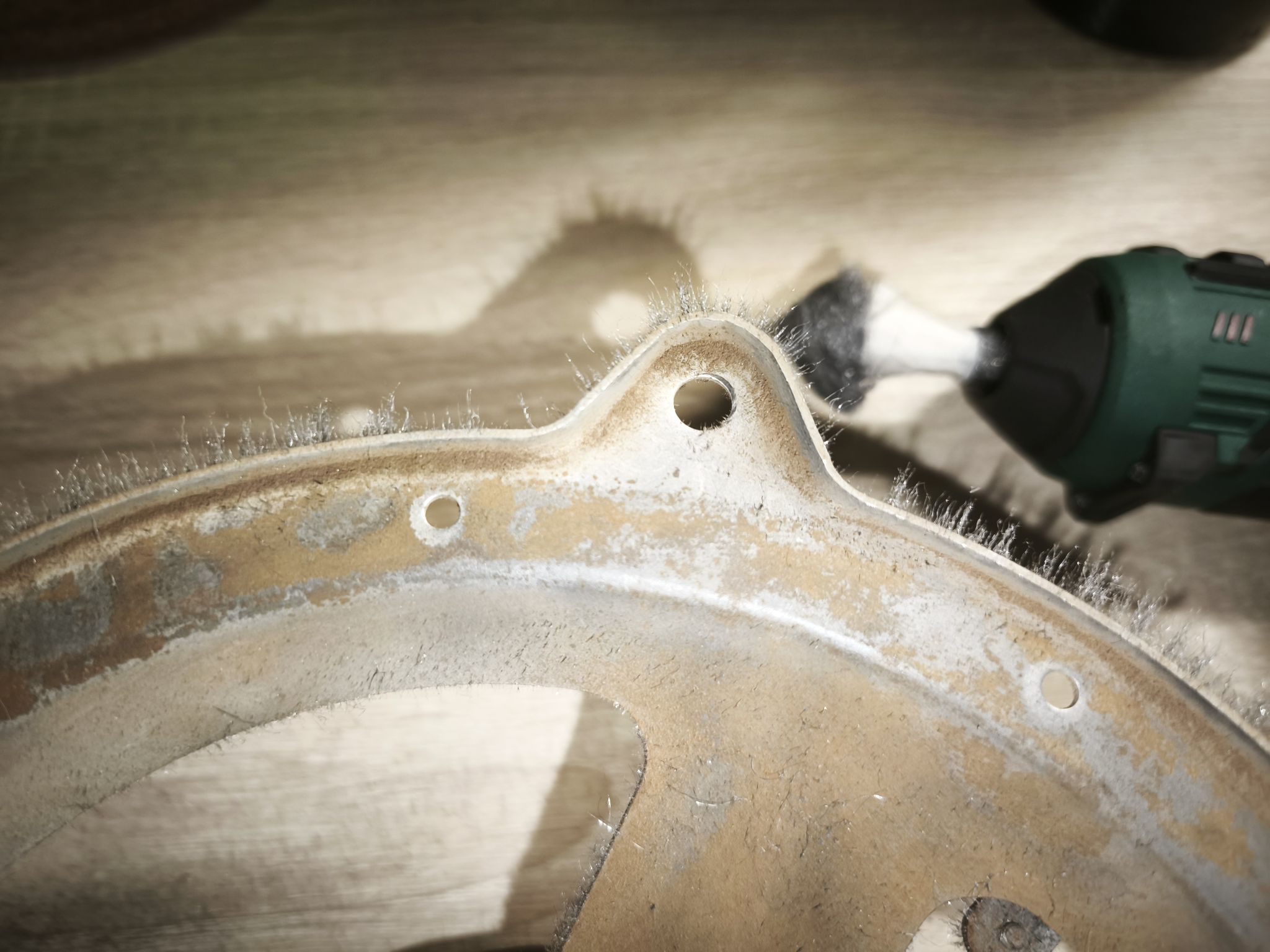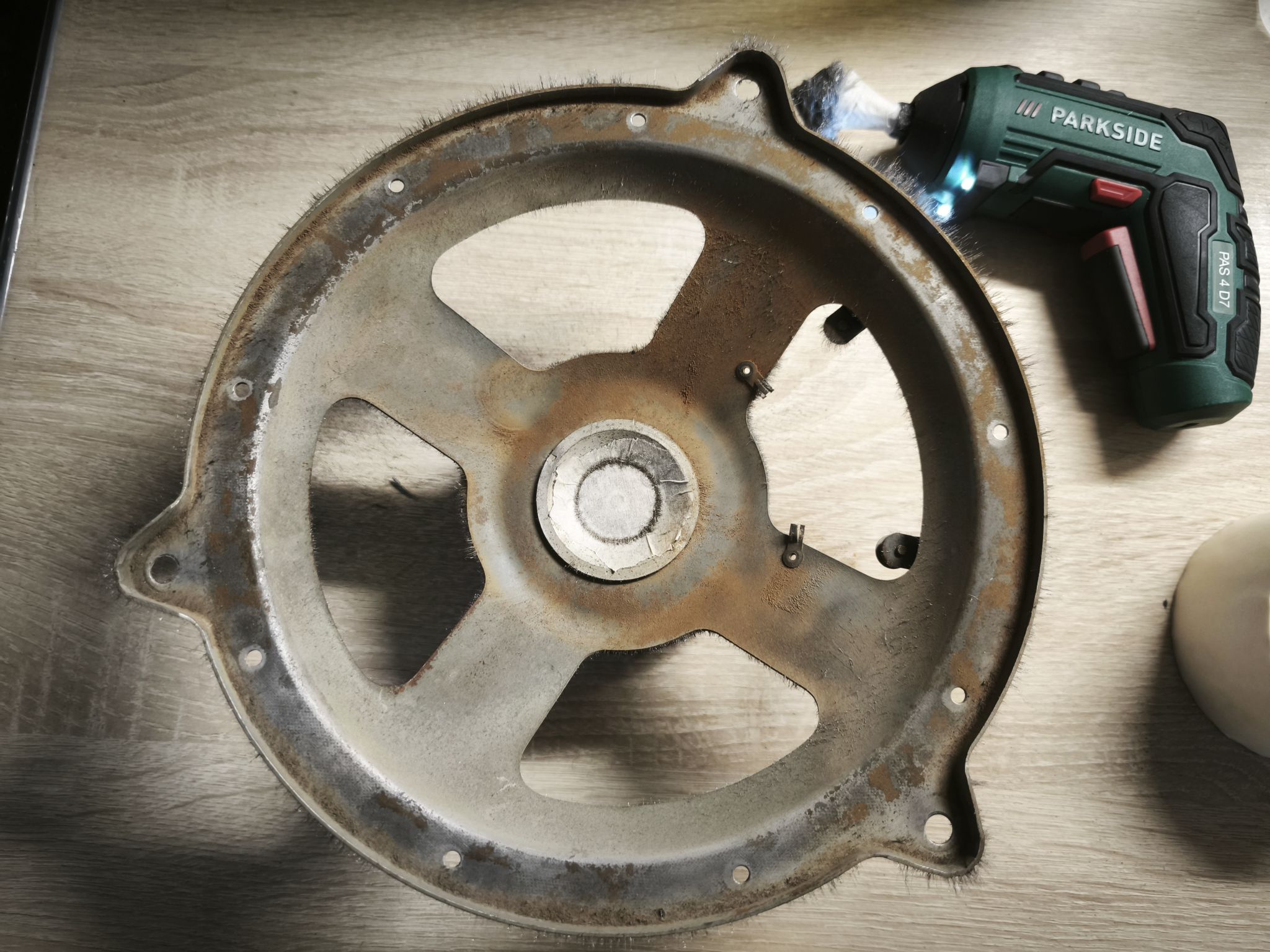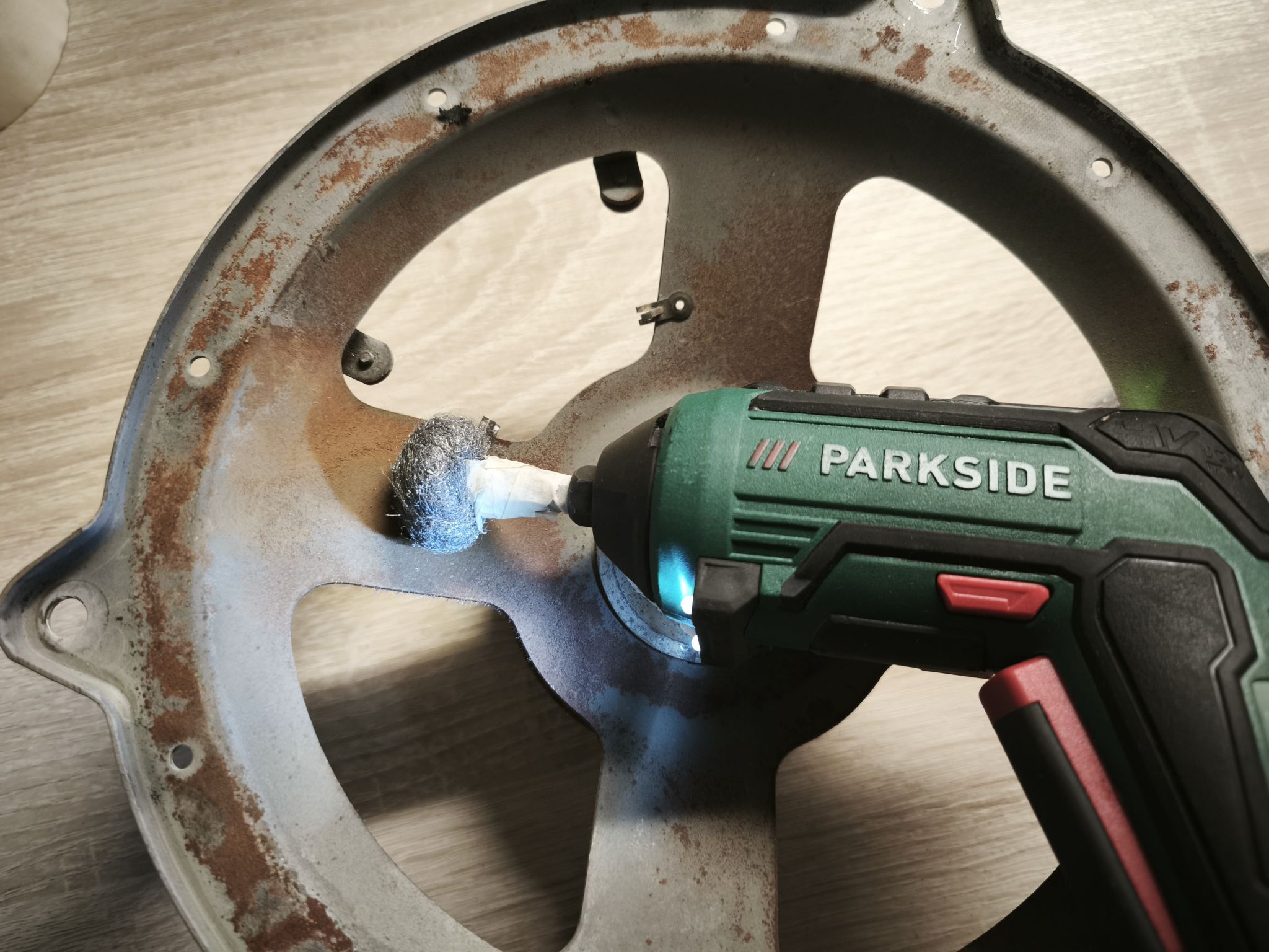 J’utilise une méthode simple mais efficace : une visseuse Lidl avec un morceau de paille de fer scotché. Attention à protéger l’entrefer avec du scotch, sinon limaille et rouille risquent de se retrouver dans l’entrefer et ca ne sera pas facile à enlever.