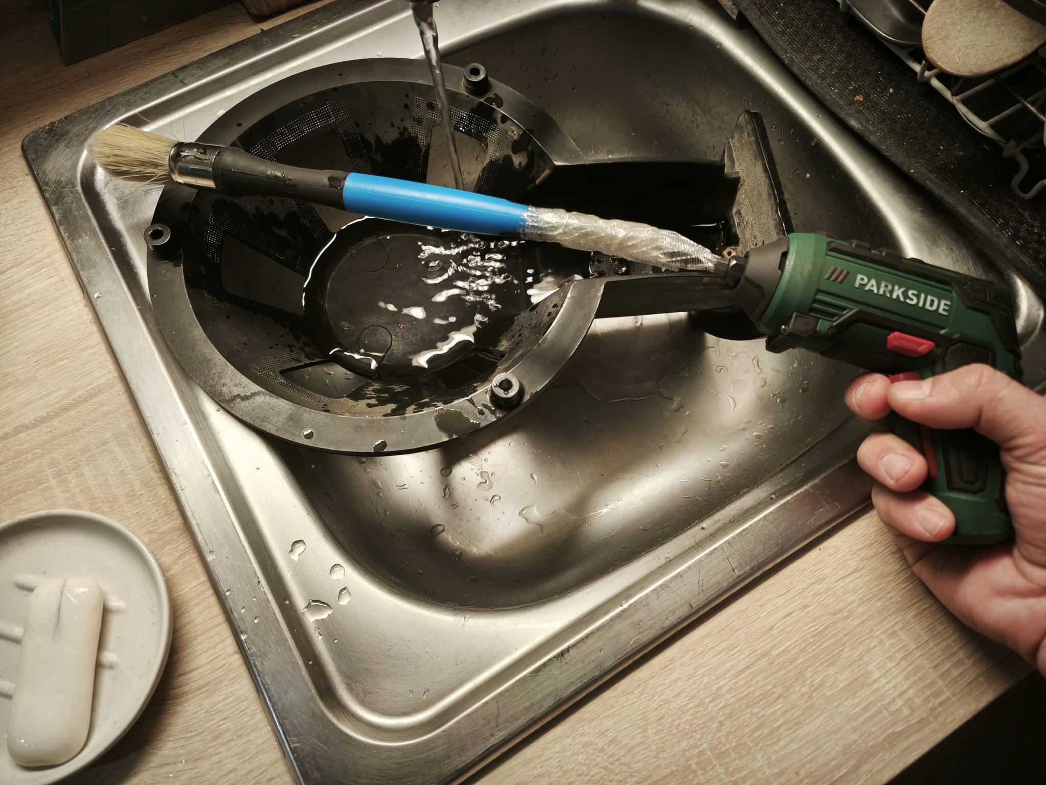 Exemple ci-dessous, où j’utilise plus d’eau à cause d’une saleté importante, mais je sèche immédiatement avec un chiffon en tapotant légèrement :